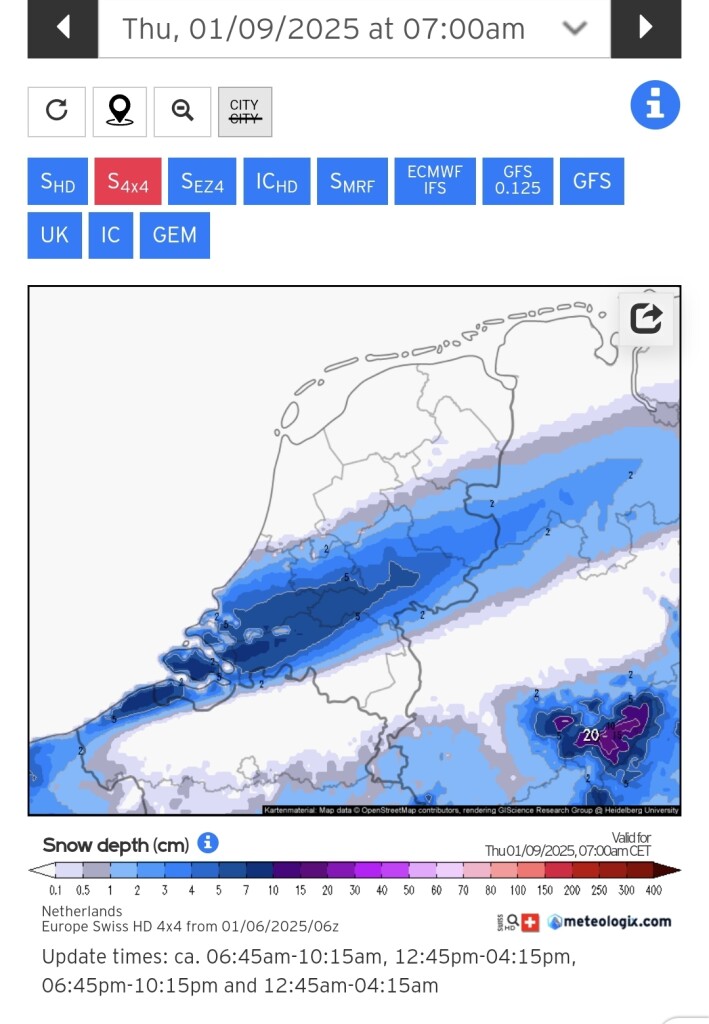 Dit zijn wel serieuze kaarten al kan het natuurlijk nog wel een aantal keren schuiven. Lokaal 5-10 cm sneeuw in de nacht van woensdag op donderdag.