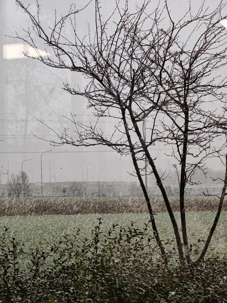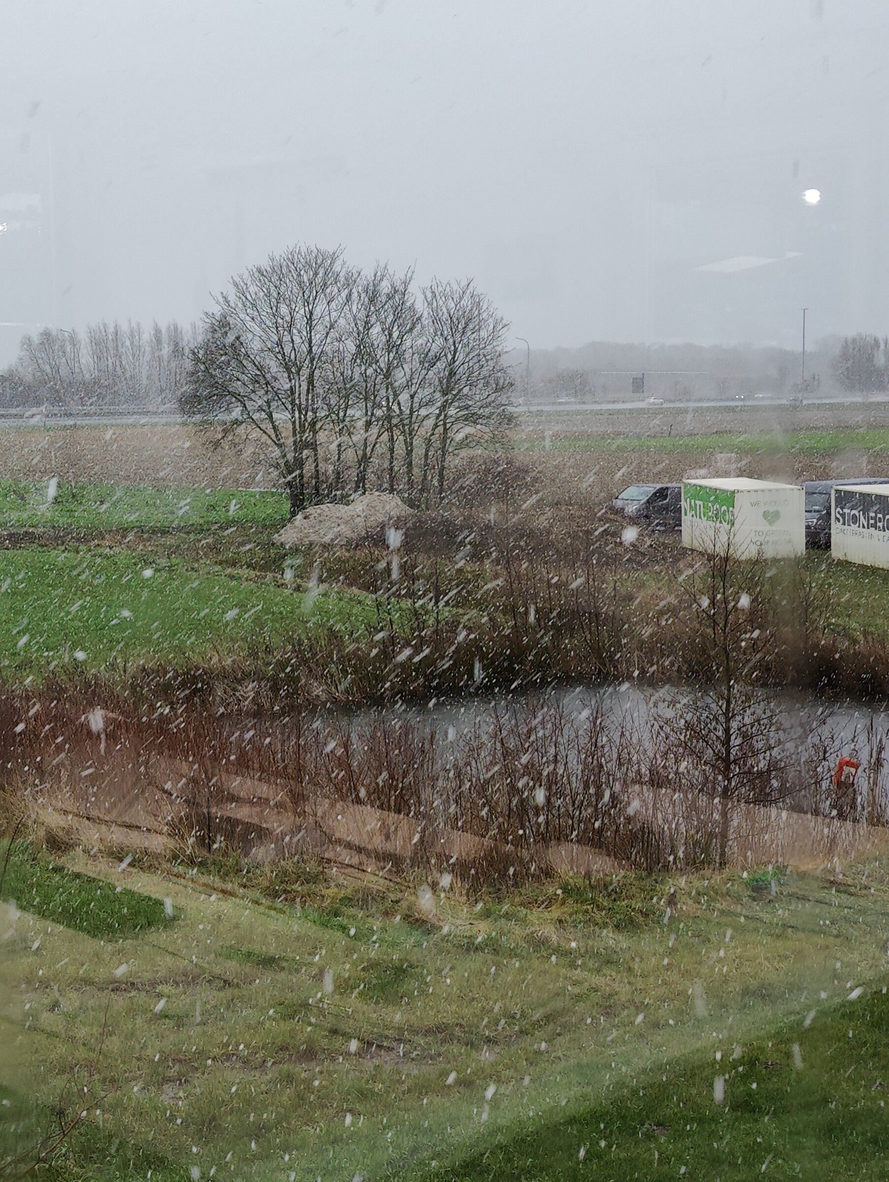 Ook hier natte sneeuwval. Blijft al wat liggen op de daken.