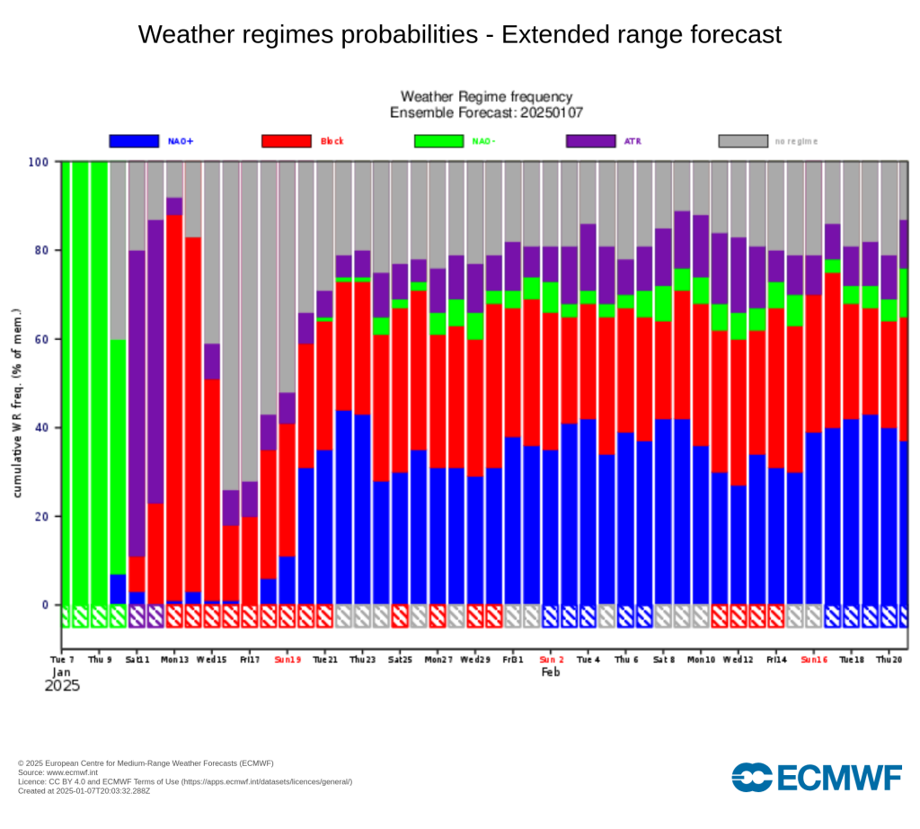 Quote selectieThis diagram shows daily probabilities for four types of Euro-Atlantic weather regimes over an approximate six-week period from the initial date.