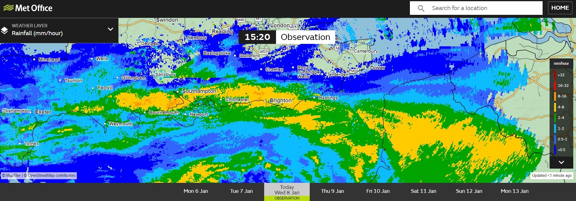 Het gene boven zuid Engeland gaat normaal via W-Vl naar het oosten straks. Nog steeds noordwaartse progressie, pakweg 30km op 1u tijd. De zone bij Southampton is normaal voor regio Brugge.