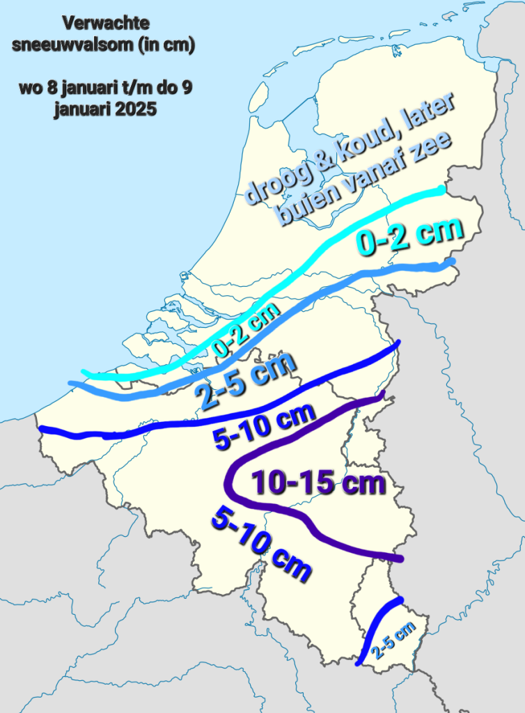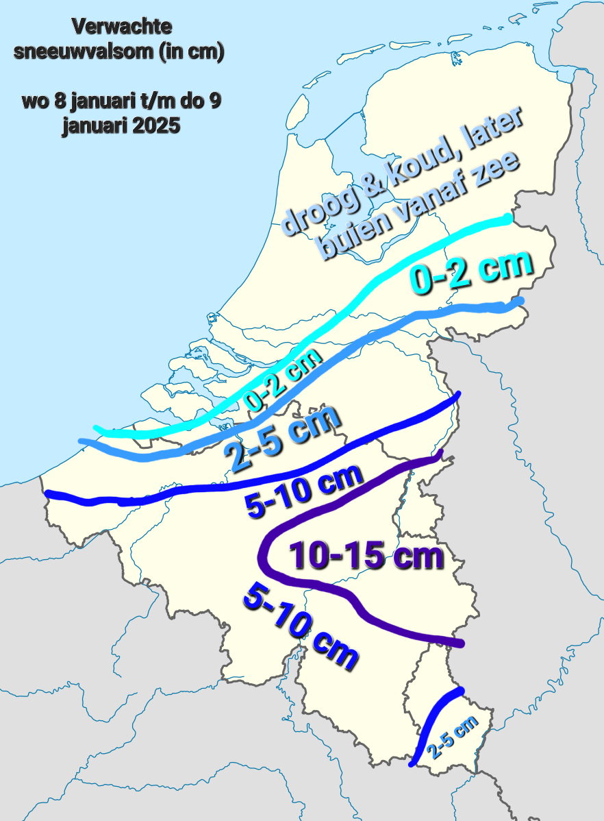 Let op: dit is niet het sneeuwdek, maar de sneeuwvalsom. Werkelijkheid kan hier flink van afwijken gezien de huidige onzekerheid!
