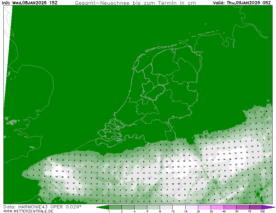 Sleidinge zal nog wel even moeten wachten op sneeuw. Zie hieronder de Harmonie sneeuwvalverwachting tot 6 uur morgenochtend. Sleidinge nog groen.