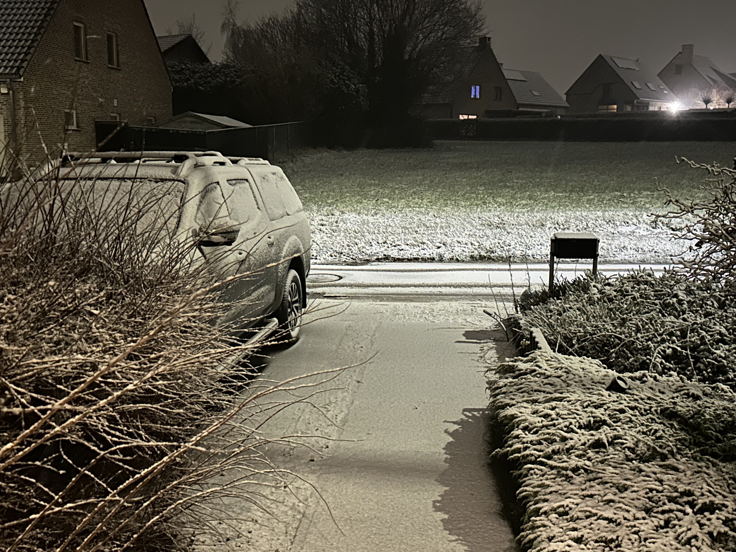 Itterbeek (Pajottenland): gesloten sneeuwdek 2cm, ook op de straat.Het sneeuwt nog door, maar sneeuw is erg nat en lijkt terug wat te dooien