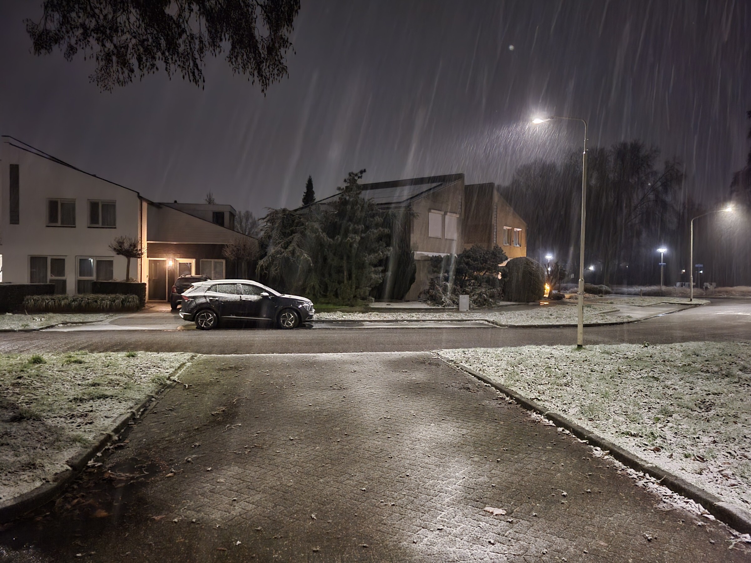 Heel lichte sneeuwval, 4cm op harde oppervlakten, 0,3°C.