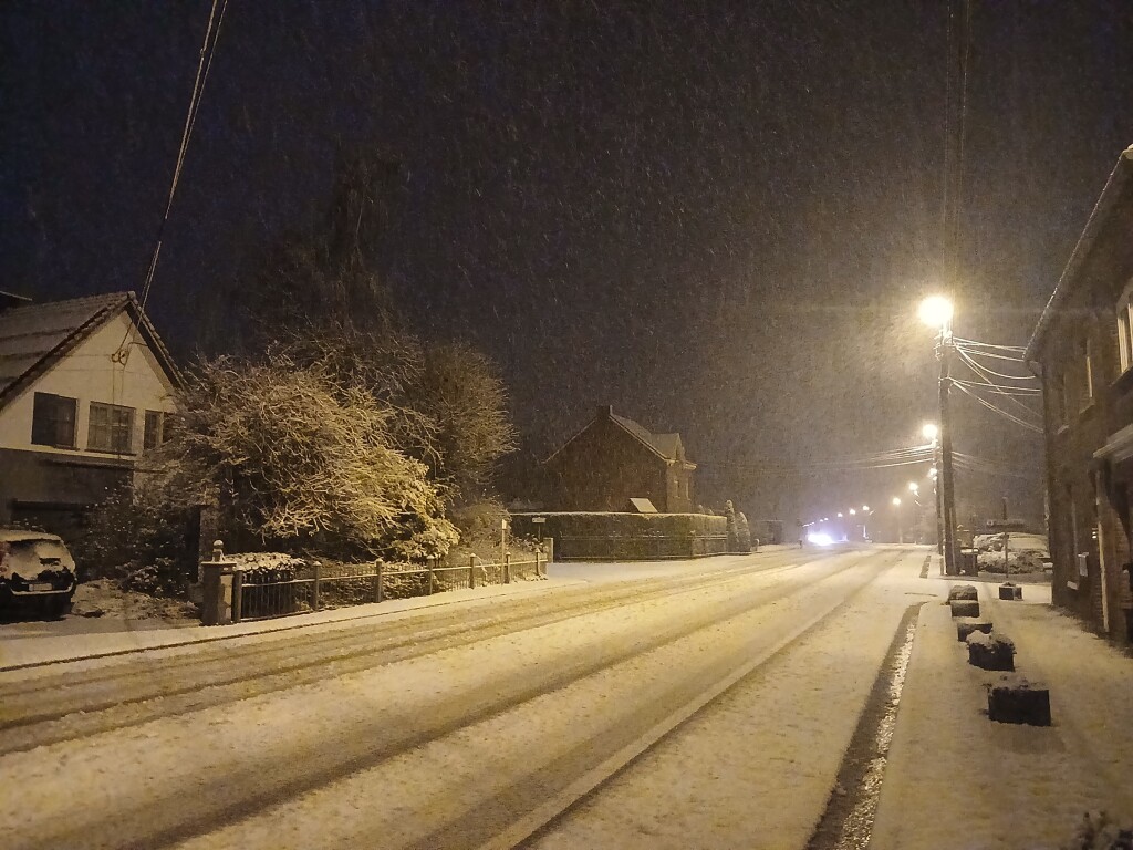 Heel lichte sneeuwval, 4cm op harde oppervlakten, 0,3°C.