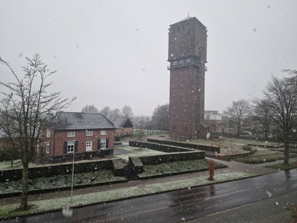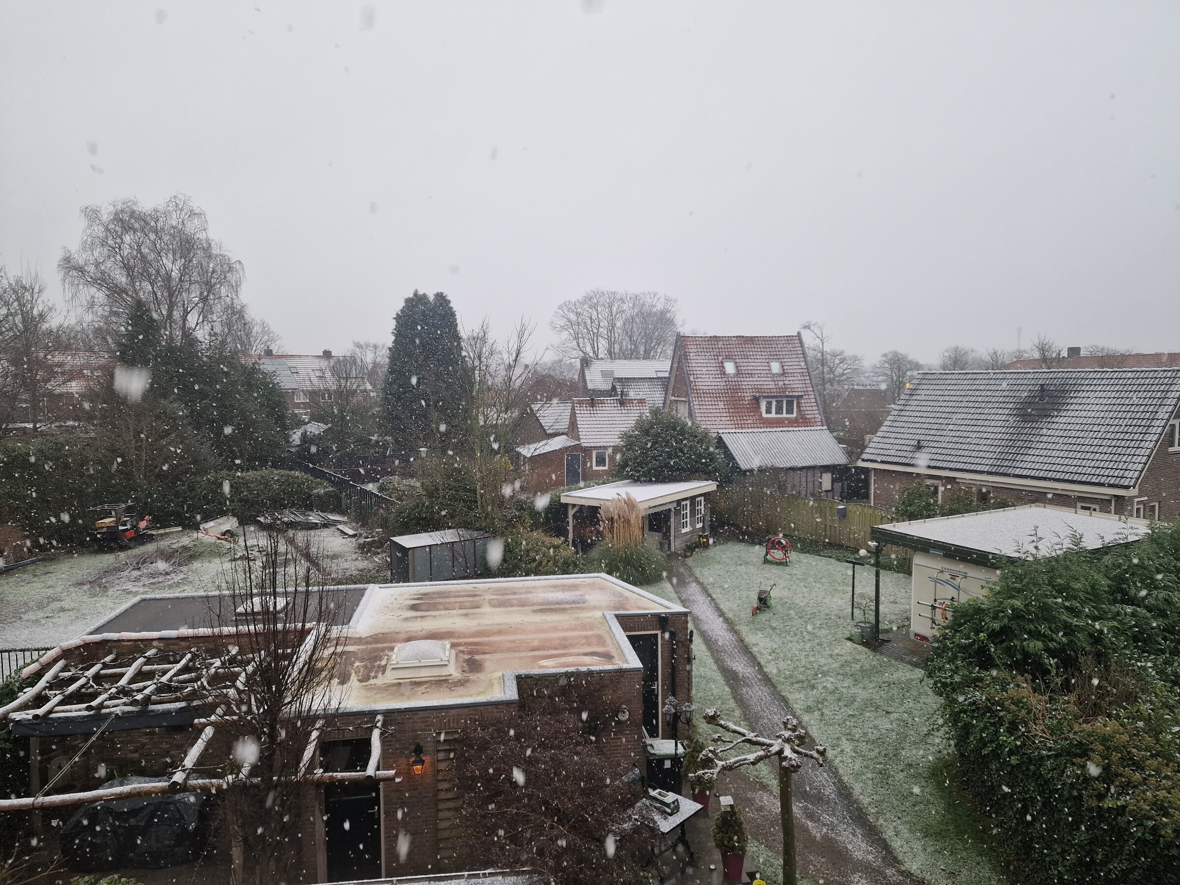 Hier sneeuwt het nu ook, maar kleine vlokjes
