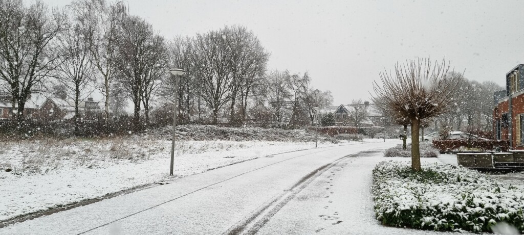 Op het gras e.d. was het al wit. Doordat het opeens harder ging sneeuwen zijn de straten ook wit geworden.
