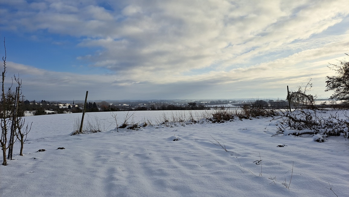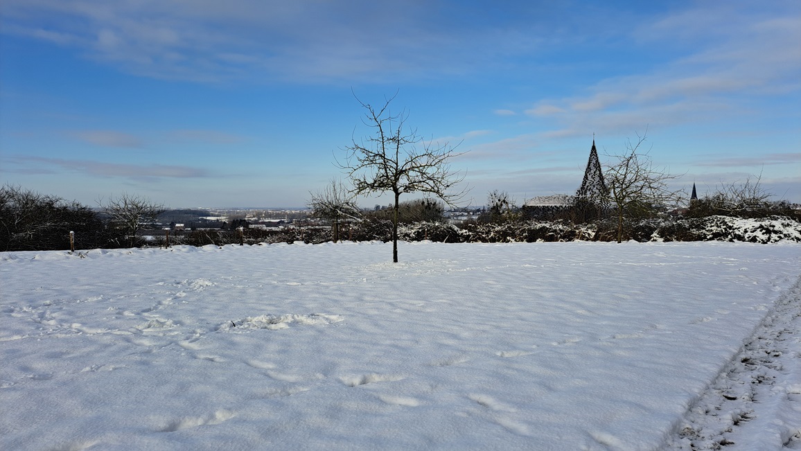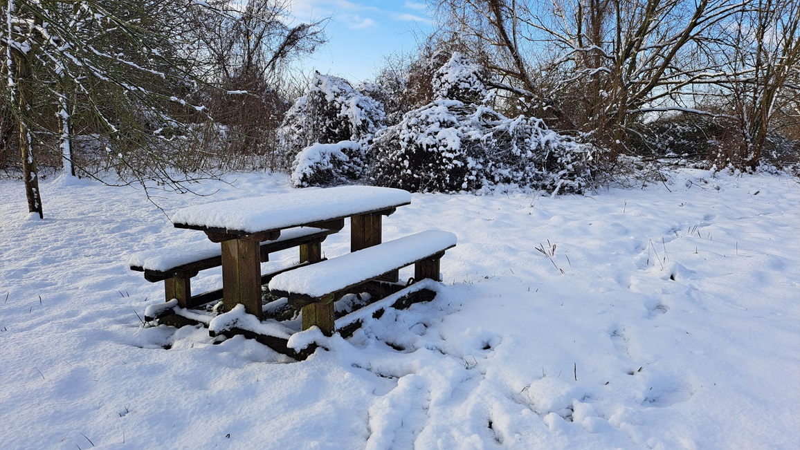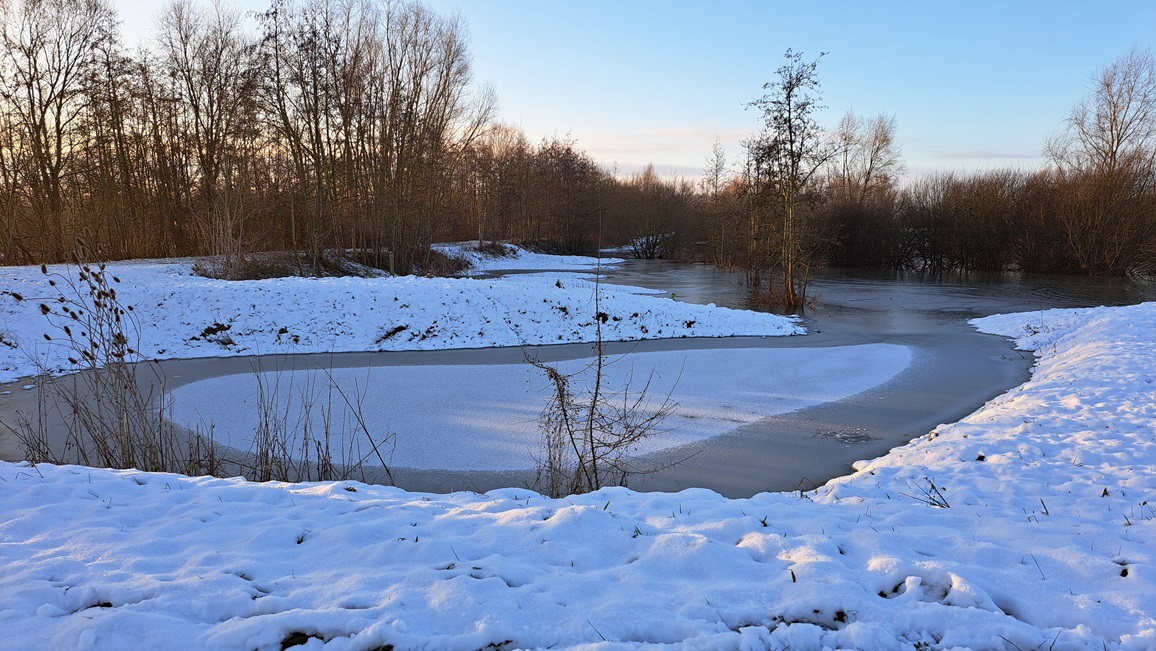 Een foto van vanmorgen uit de buurt, het bufferbekken van Bernissem dat ingericht is als natuurgebied, bij 5-6 cm sneeuw: