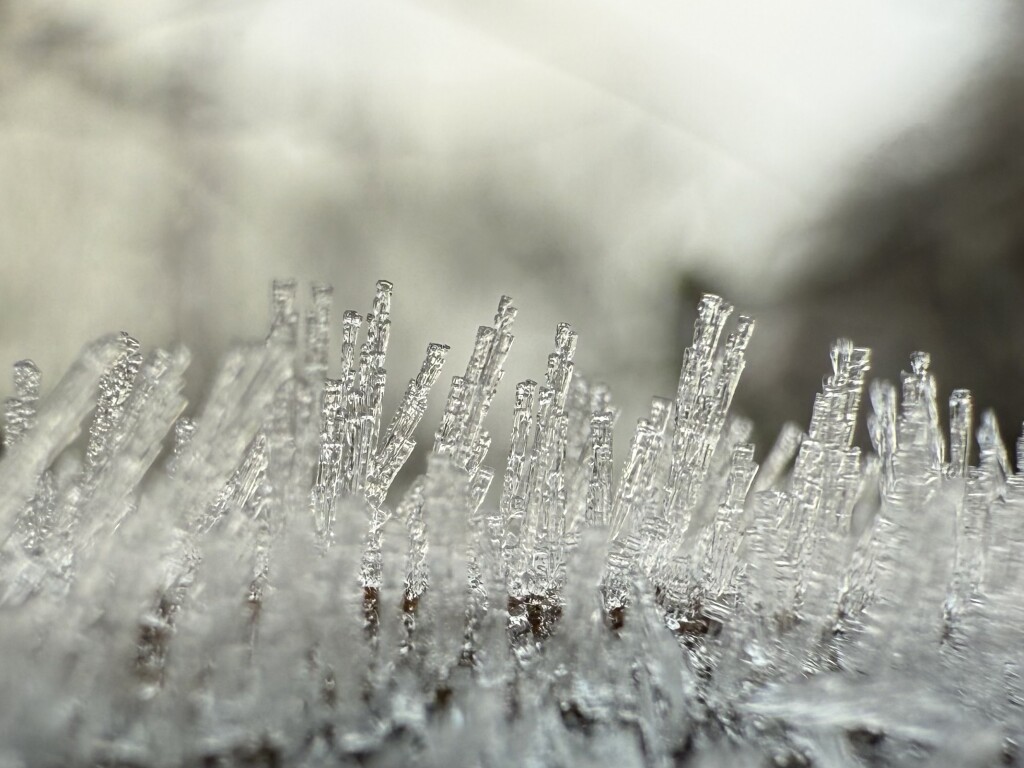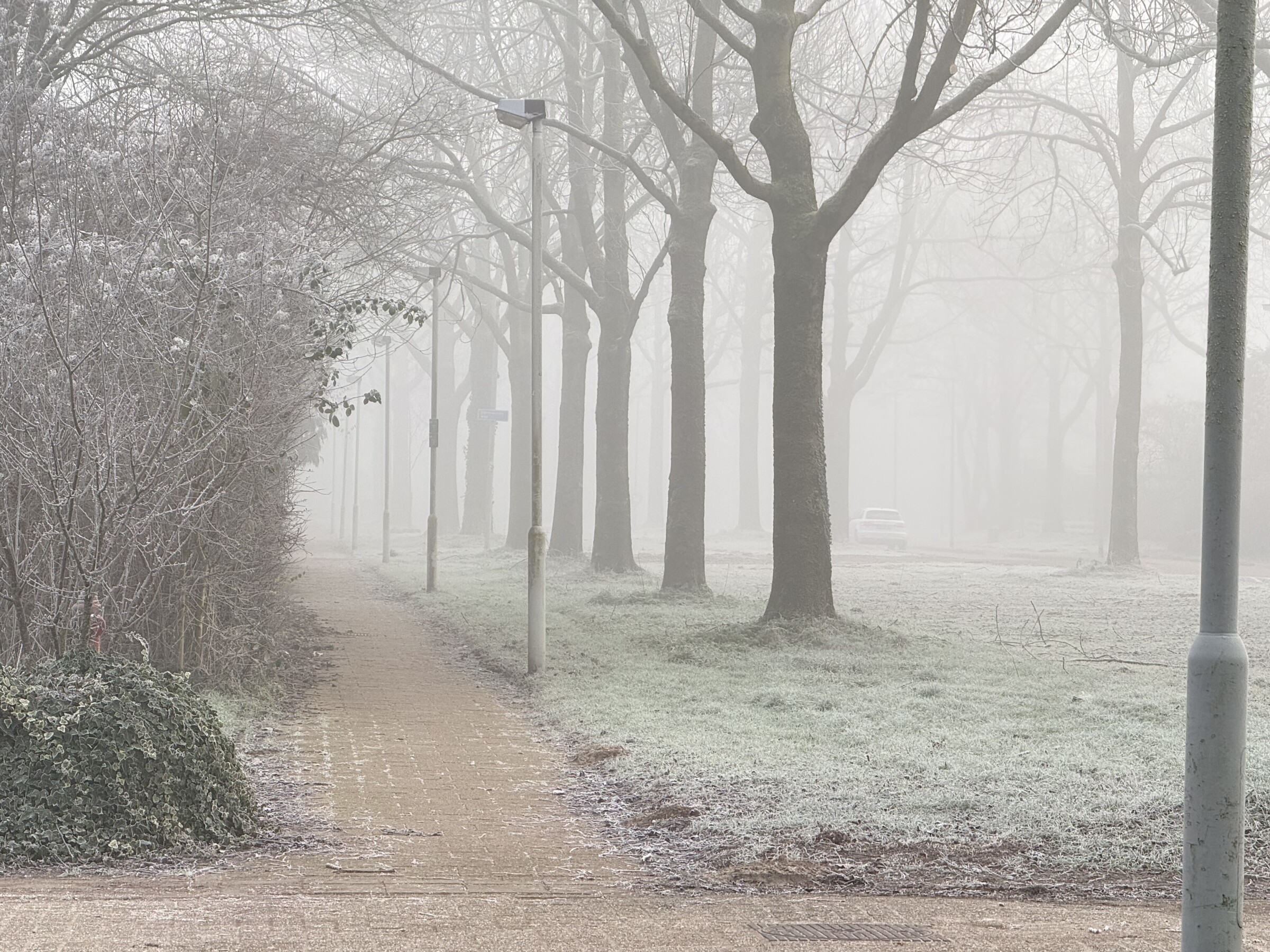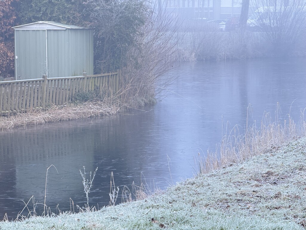 Er is vannacht wat rijp ontstaan. Het heeft een prachtige structuur. Momenteel is het nog steeds flink mistig en het vriest nog. De sloten zijn dichtgevroren.