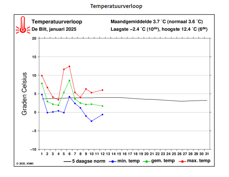 Volgens het KNMI zelf in hun grafiek iets hoger dan normaal qua temp voor de eerste 12 dagen.