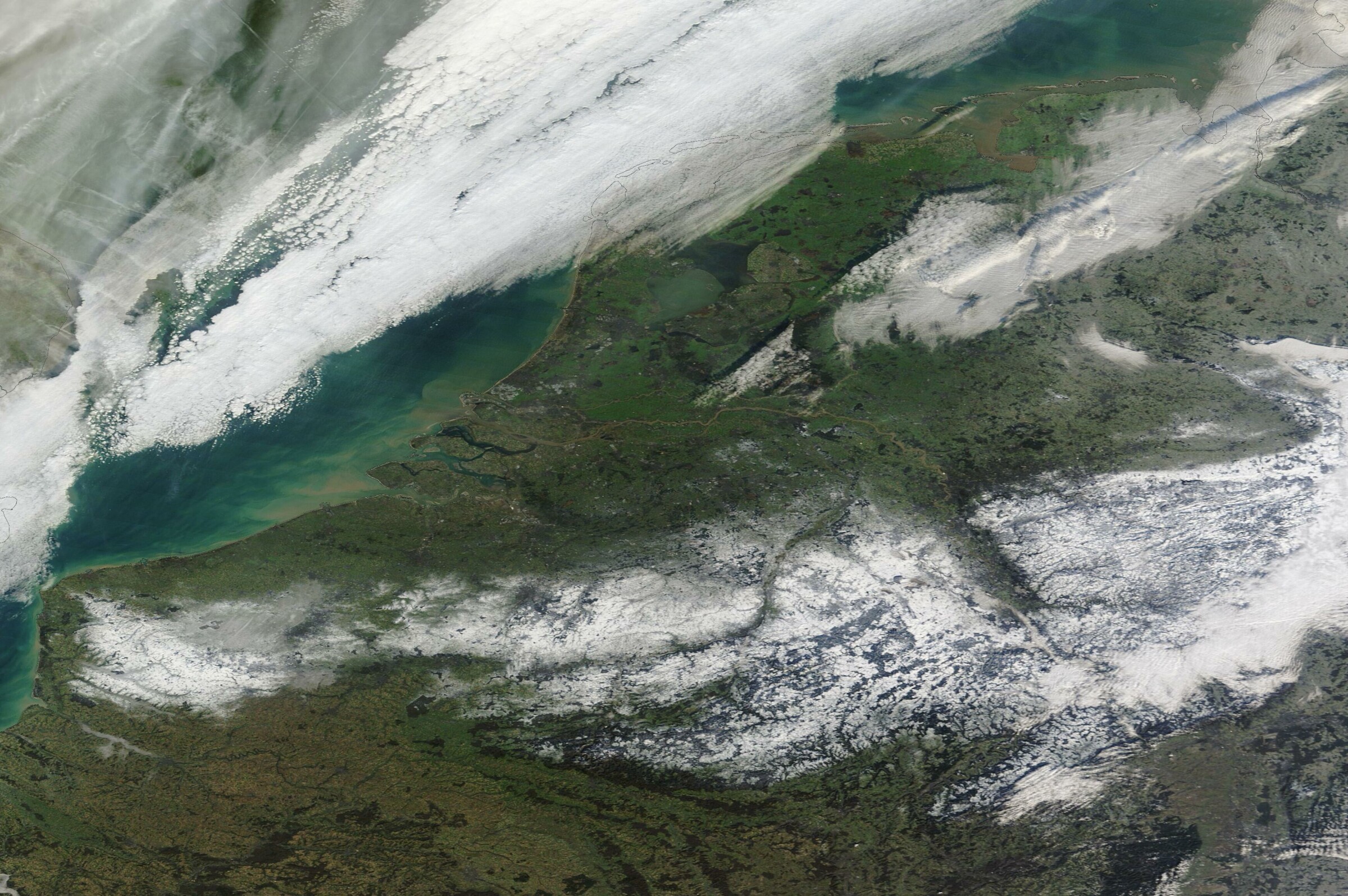 In het Noordwesten en Oosten nog wat bewolking zichtbaar en in Zuid-Limburg, delen van Noord-Brabant en onze zuiderburen een prachtig sneeuwdek in de zon vandaag. Het Maasdal en bredere Rijndal zijn ook goed te onderscheiden.