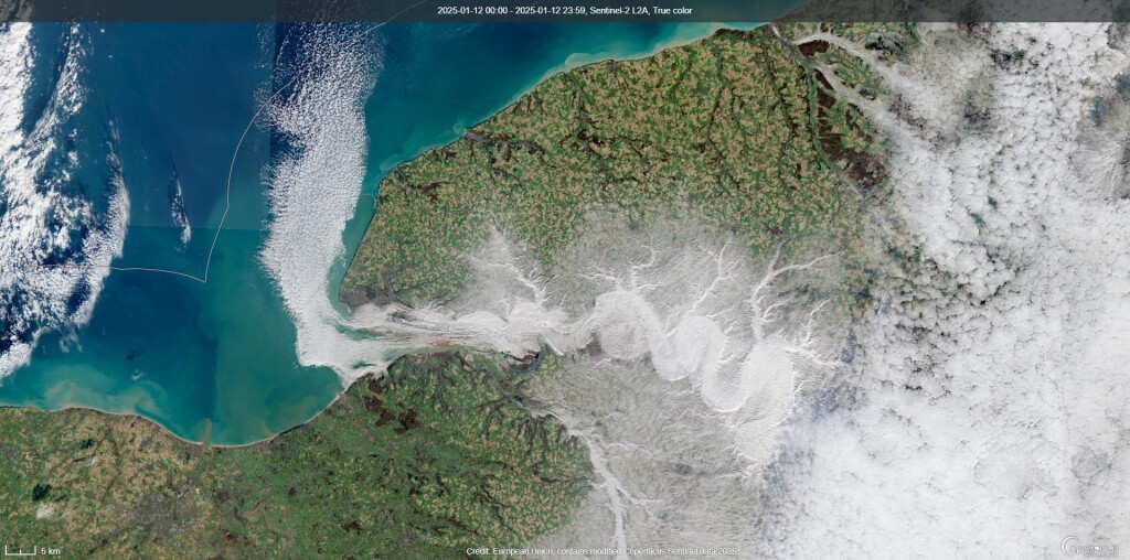 Ook een pareltje van de Copernicus gister boven de Noord Frankrijk. De Seine als mistrivier met koude, verzadigde lucht stroomt richting zee en verandert in stratus (trechtereffect?). Ook vandaag op MODIS te zien.