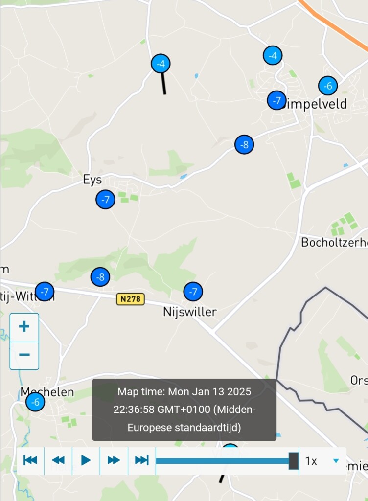 Amateurstation geeft waarden van -8.7°C aan, in de omgeving veelal -7 a -8 op de amateurstations. Op naar strenge vorst ook op Nederlandse bodem?