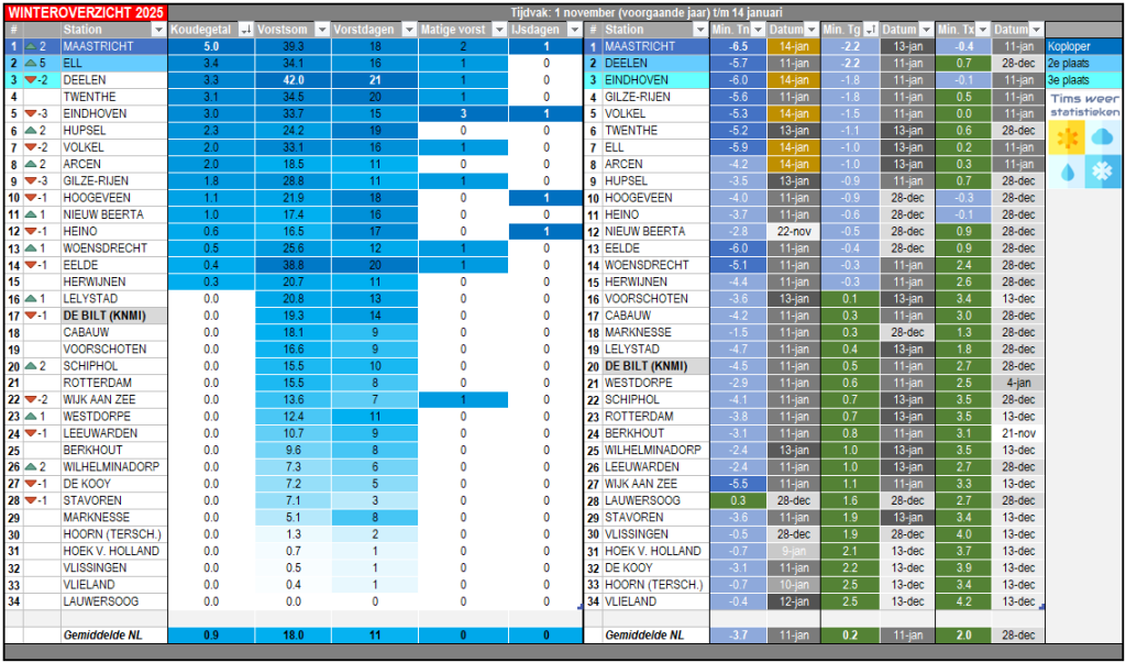13 jan - Maastricht een etmaalgemiddelde van -2,2°C en heeft de leiding overgenomen van Deelen met 4,0 Hellmannen.