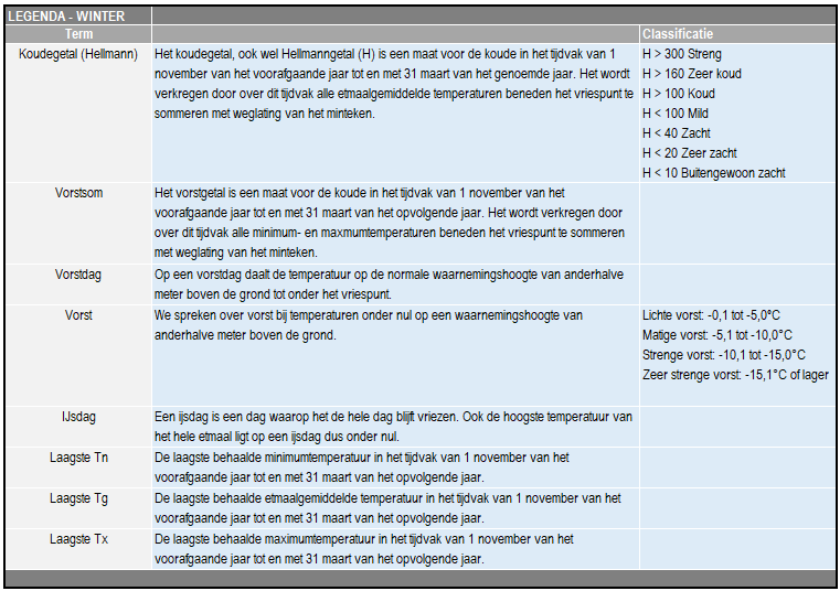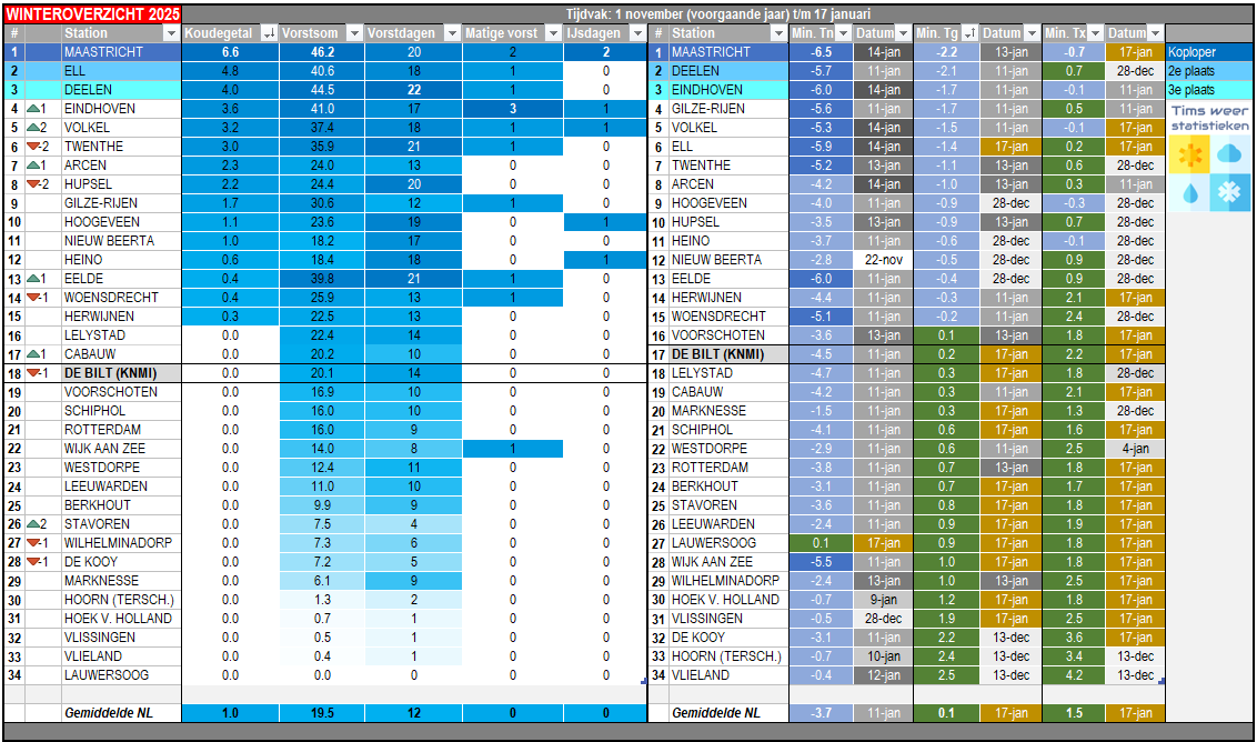 Er zijn weer een aantal Hellmannen bijeensprokkelt maar De Bilt valt nog steeds buiten de boot. Maastricht houdt de leiding in het koudegetalklassement met nu 6,6 punten. De gemiddelde totale vorstsom in Nederland bedraagt nu 19,5 en in De Bilt 20,1 met gemiddeld in het land 12 vorstdagen. Alleen Lauwersoog noteerde nog geen enkele vorstdag. In Deelen kwam het al tot 22 vorstdagen. Maastricht is het koudste station met een totale vorstsom van 46,2. De laagste temperatuur tot nu toe bedraagt -6,5°C in Maastricht behaald op 14 januari.