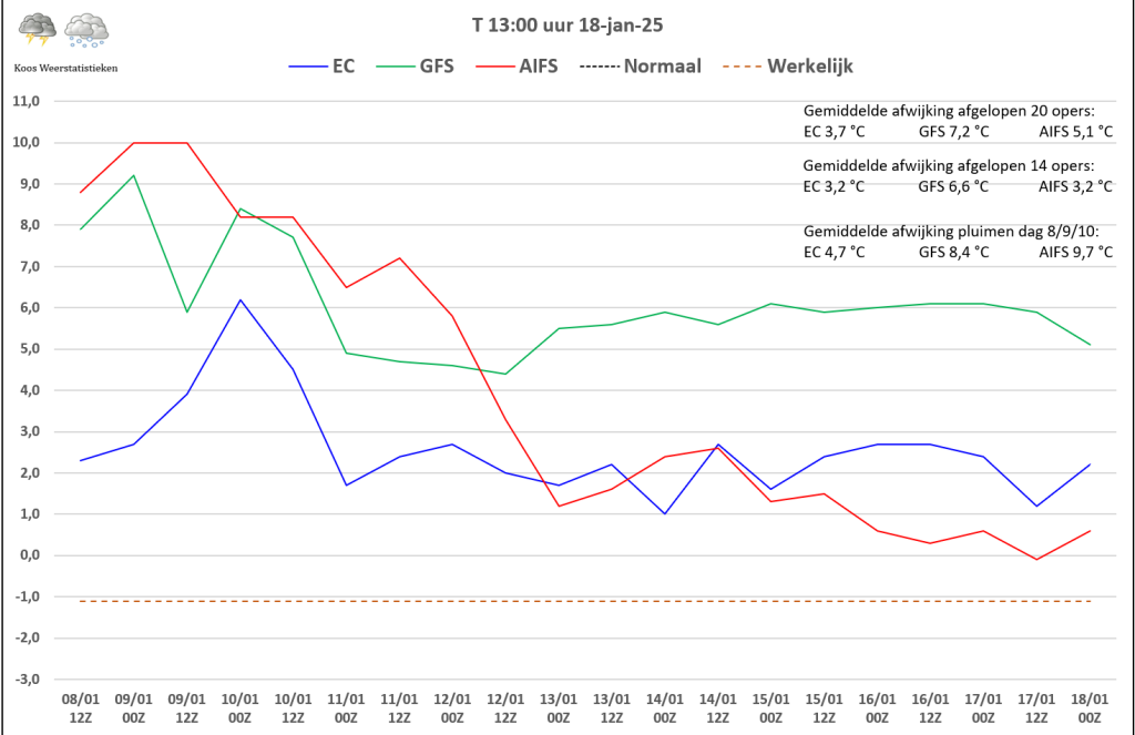 Goed te zien dat de eerste dagen dat er een verwachting kwam voor 18 januari (13:00 uur)de drie modellen er stevig naast zaten met AIFS als koploper. Vervolgens trok de oper van EC als eerste bij richting een koudere oplossing. AIFS volgde wat later. Op het laatst trok AIFS het sterkst naar de uiteindelijke uitkomst van -1,1 °C. GFS is er tot op het laatst ver vanaf blijven zitten.