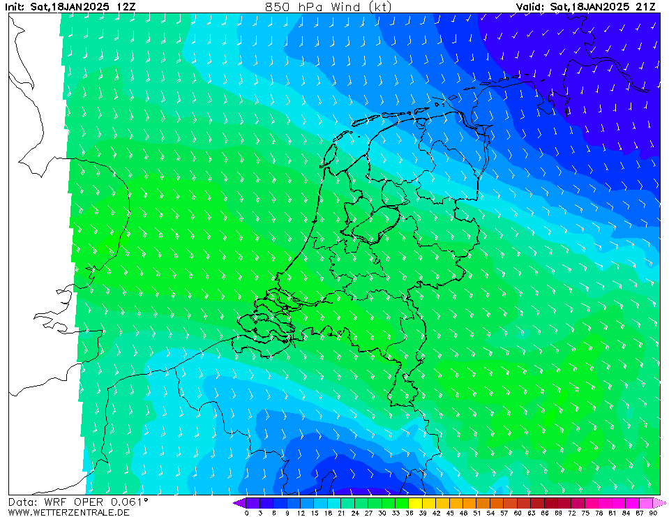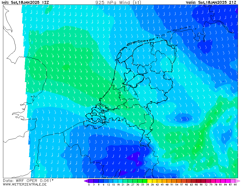 Aan de grond weinig verschil over NL, maar op hoogte zie je een duidelijke zone met hogere windsnelheden op 925 hPa en 850 hPa (500-1500 m). Aangezien boven die hoogte lente-achtige temperaturen zijn zie je de boel nu mengen, opwarmen en oplossen. Zicht inmiddels >5.000 m hier.