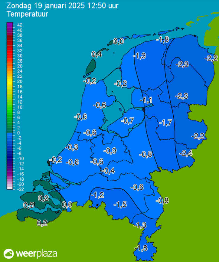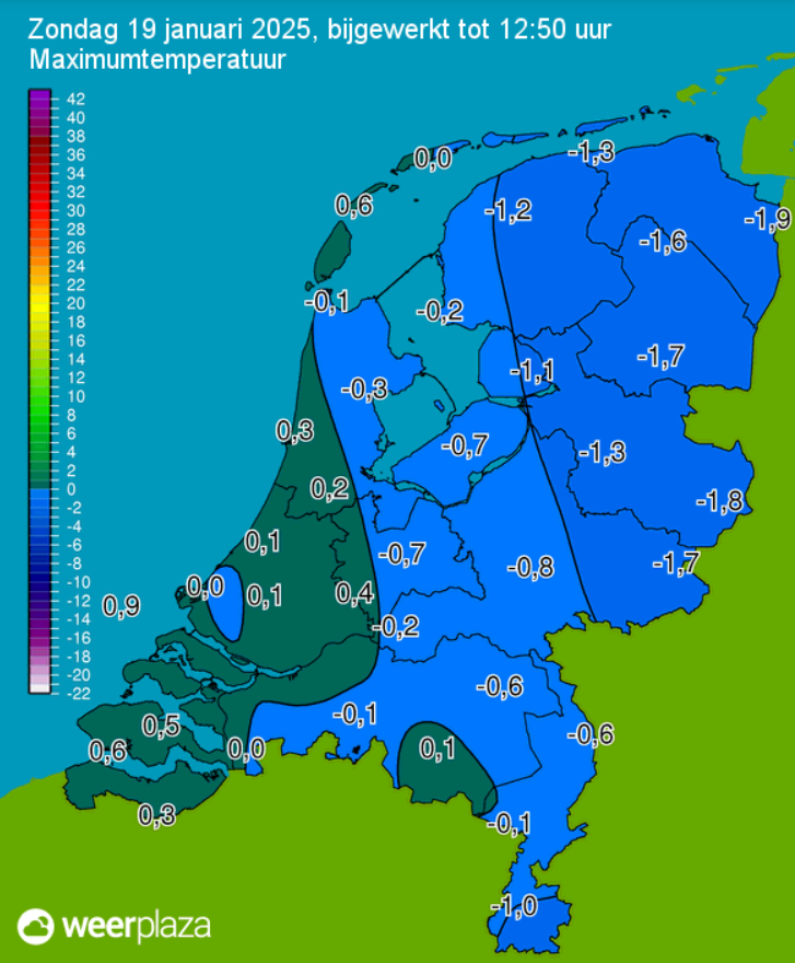 Volkel en Maastricht zijn op weg naar de derde ijsdag op rij. De Bilt noteert vandaag zijn tweede ijsdag op rij. Hier in het noordoosten vriest het gewoon midden overdag meer dan 2 graden.