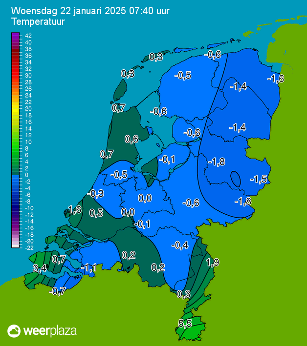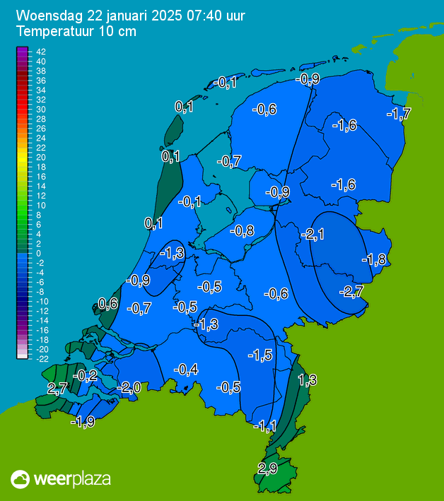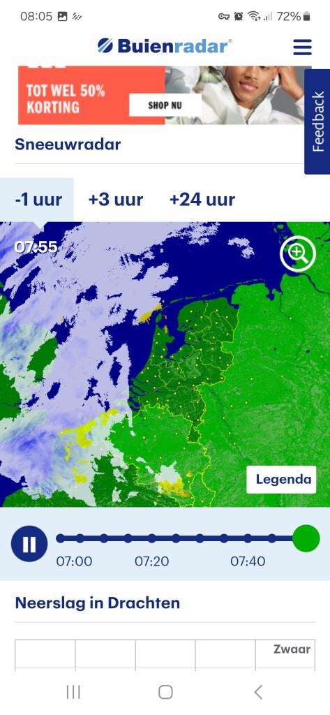 Dauwpunten onder 0. Temperaturen op neushoogte als aan de grond onder 0. Er komt toch beste pluk neerslag aan? Op hoogte nu nog restant zachte lucht maar die trekt NO waarts weg.