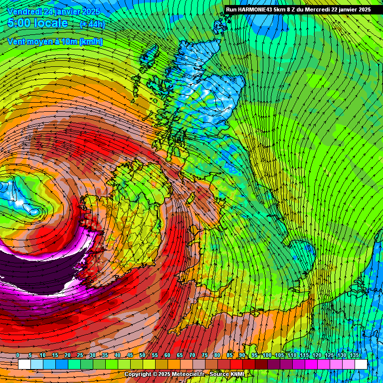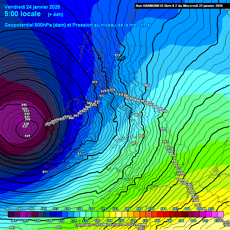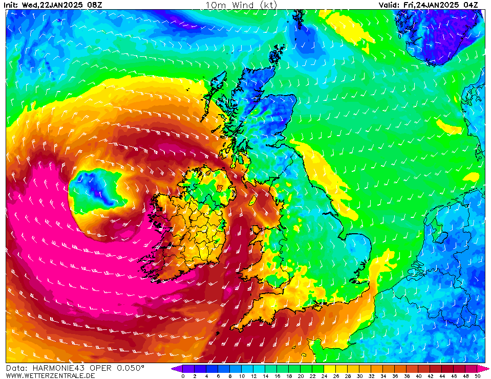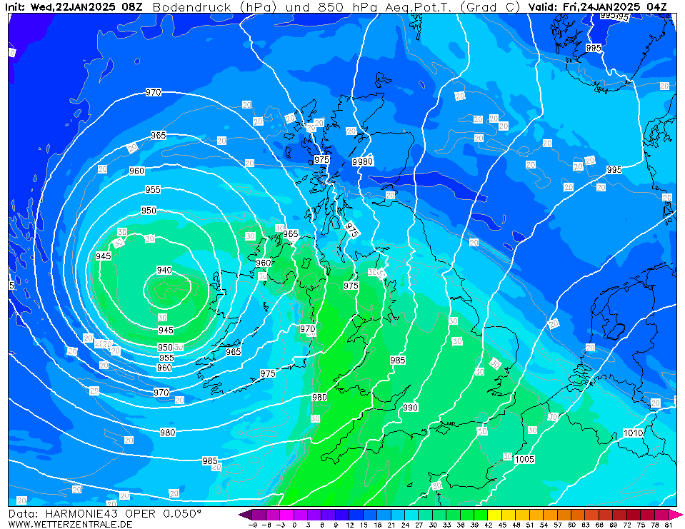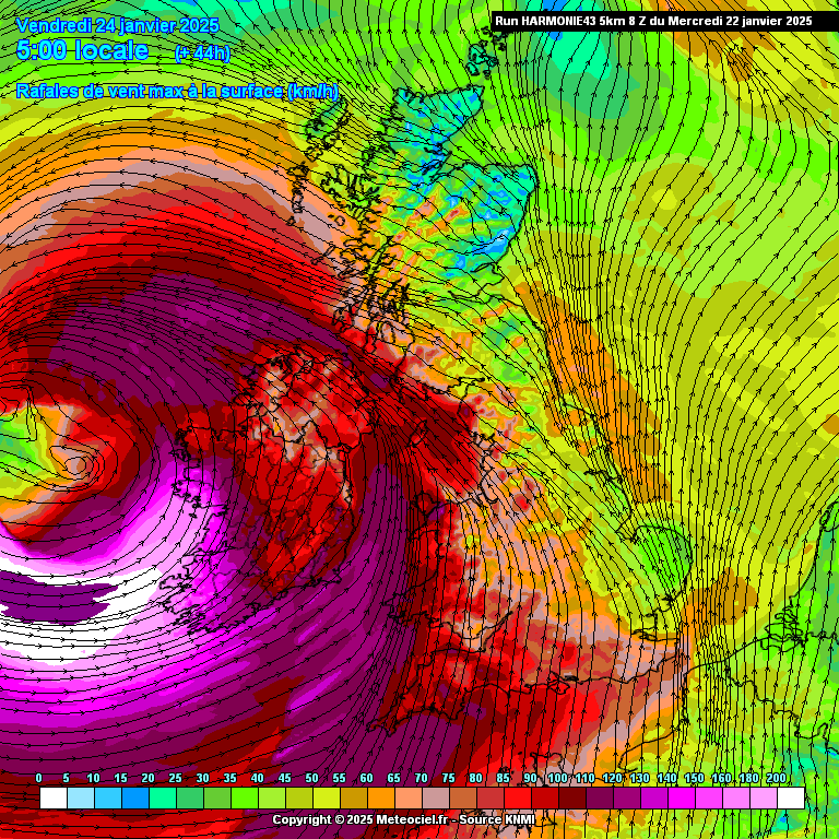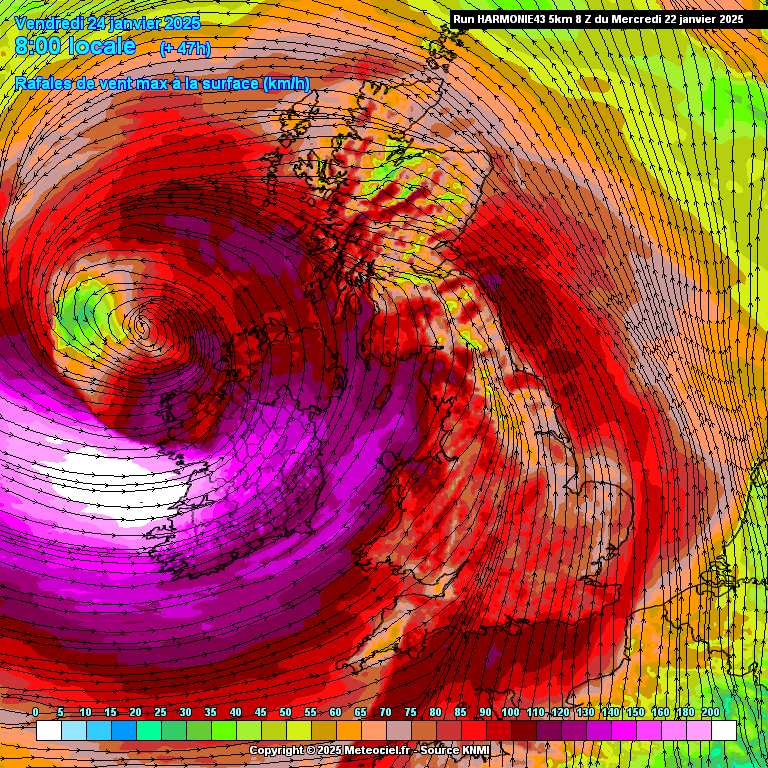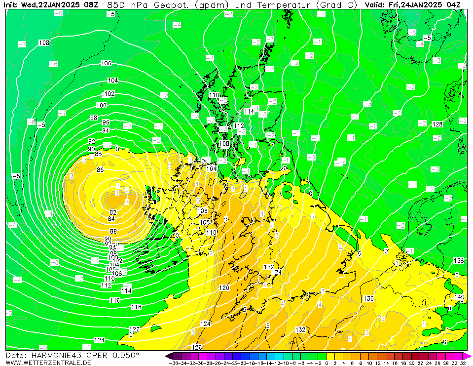 Het hele verloop van de storm is nu zichtbaar in de Harmonie uitvoer. Er zullen wel vergelijkbare of zwaardere stormen in het verleden geweest zijn, maar voor Harmonie moet dit toch wel één van de zwaarste zijn uit de geschiedenis van het weermodel. De 200-plussers blijven waarschijnlijk boven zee, maar windstoten van 150-200 km/h aan de kust en 100-150 km/h landinwaarts zijn gewoon extreem. Kerndruk daalt mogelijk onder de 940 hPa.