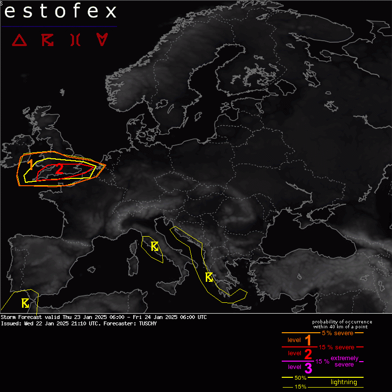 This drop in thickness is accompanied by an impressive 200 kt zonal jet along its southern fringe, which points towards NW Europe. A rapidly approaching surface low from the SW (probably in form of a diabatic Rossby wave) crosses this jet to the north. Its attendant moisture rich cross-isentropic WCB ascent and attendant strong irrotational wind response cause a splitting upper jet with a resultant coupled jet configuration (combined with extreme upper divergence). A 24h MSLP drop in the latitude corrected 2 bergeron range is forecast and this depression approaches Ireland during the end of the forecast from the SW. It reveals an impressive warm seclusion structure and we would not be surprised to see a mixed cold jet (potential sting jet) event evolving offshore with NWP guidance offering gusts up to 200 km/h. Convective-wise there seems to be no substantial risk of activity despite some isolated CI along the leading edge of the NE ward wrapping dry slot. Forecast soundings don't support electrified convection. Anyhow, severe to extreme gusts are possible, but limited confidence in CI precludes any level issuance. Slantwise convection along the tip of the cold jet remains offshore until 06Z without lightning activity.
