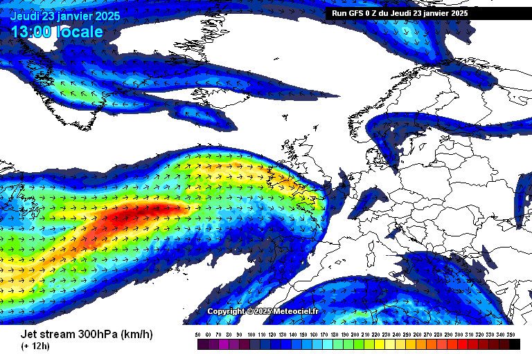 Deze 'splitting upper jet' is te zien in de weergave van GFS bij Meteociel (tweede afbeelding). Iets eerder vormde de jet nog een geheel over de oceaan.