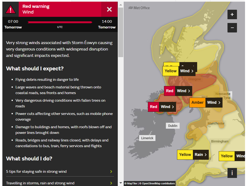 Voor het eerst in de geschiedenis heeft de Met Office code rood afgekondigd voor Noord-Ierland. Ook in delen van Schotland is er opgeschaald naar een weeralarm. De waarschuwing is actief voor zeer zware windstoten van 130-145 km/u op uitgebreide schaal, langs de kust 160 km/u. Dit alles voor morgen vanwege storm Éowyn. Gisteren had de Met Éireann al een landelijke code rood afgekondigd voor Ierland.