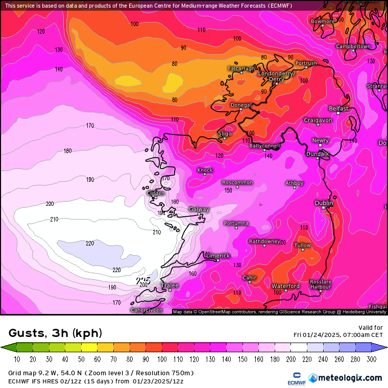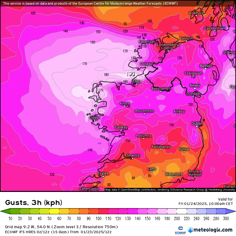 Als je kijkt naar de intense 200+ km/h windstoot kaarten van ECMWF dan komt dat goed overeen met wat er is gemeten. Er zijn simpelweg weinig meetstations in Ierland. Op de plaatsen dat stations staan kwam de verwachting goed overeen. De locatie waar 184 km/h is gemeten had volgens de kaarten hieronder windstoten van ~190 km/h kunnen verwachten. De hoogste windstoten 210 - 230 km/h bleven waarschijnlijk boven zee en als ik naar de modellen kijk dan denk ik dat de kans groot is dat er in de buurt van Foynes in het westen van County Clare windstoten waren rond de 200 - 210 km/h, maar daar is simpelweg geen meetstation. Wij zijn Nederland gewend dat we zo'n dichte constellatie meetstations hebben dat bijna alles wordt gemeten, maar in veel andere landen is dat niet zo (zeker als er niet een organisatie zoals NHC/NOAA is die expres op zoek gaat naar de hoogste windsnelheden in orkanen) en moet je gewoon geluk hebben. In Finner bij Sligo zijn windstoten van 151 km/h gemeten wat zelfs iets boven de verwachting was.