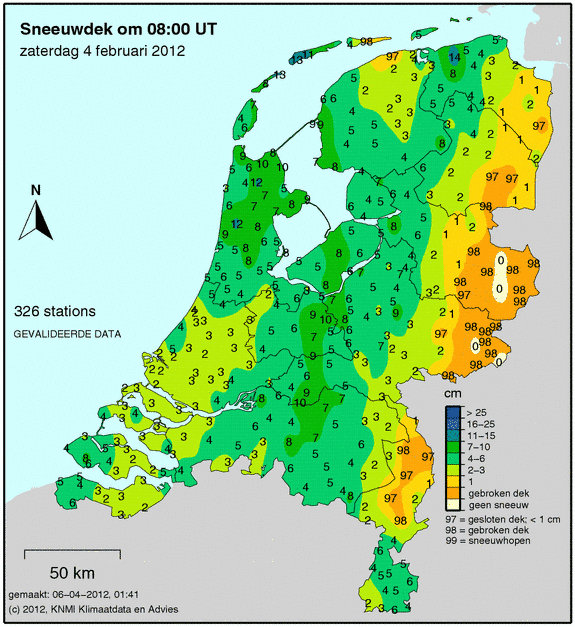 Het einde van de fabuleuze winterperiode. De eerste 11 dagen van februari 2012 zijn de koudste geweest sinds 1901! Vandaag werd er nog volop geschaatst, de laatste schaatsdag. Afgelopen nacht en vanochtend vroeg trok het warmtefront over met her en der wat lichte sneeuwval (lokaal wat meer, in delen van Zuid-Holland kwamen meldingen van 1 a 2 cm) en ijsregen. Daar achteraan schoof het koufront in de middag binnen met op grotere schaal wat sneeuwval, aan de achterzijde ook enige lichte regen. Die zone met neerslag bevondt zich rond 16.00 uur van Zuid-Holland, via Utrecht en Flevoland tot over Overijssel en Zuid-Drenthe. Her en der wordt melding gemaakt van lichte sneeuwval, of motsneeuw. Sommige waarnemers melden zelfs even matige sneeuw. In Amstelveen vormt zich zelfs een dekje.