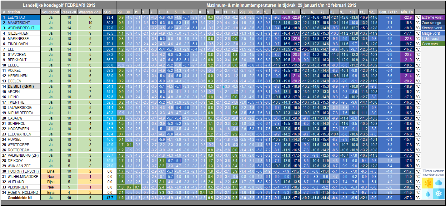 In grootste deel van het land (met uitzondering van de Wadden en de zuidwesthoek) kwam het tot een officiële koudegolf. Het gemiddelde koudegolfgetal (KGg) in Nederland bedroeg 47,7 (De Bilt: 54,1) en een koudegetal (Kg) van 84,3 (De Bilt: 87,1). Lelystad is het koudste station met een totaal koudegolfgetal (KGg) van 83,4 en een koudegetal (Kg) van 107,9. De laagste temperatuur bedroeg -22,9°C in Lelystad behaald op 4 februari. In Maastricht kwam het op maar liefst 10 dagen tot strenge vorst.