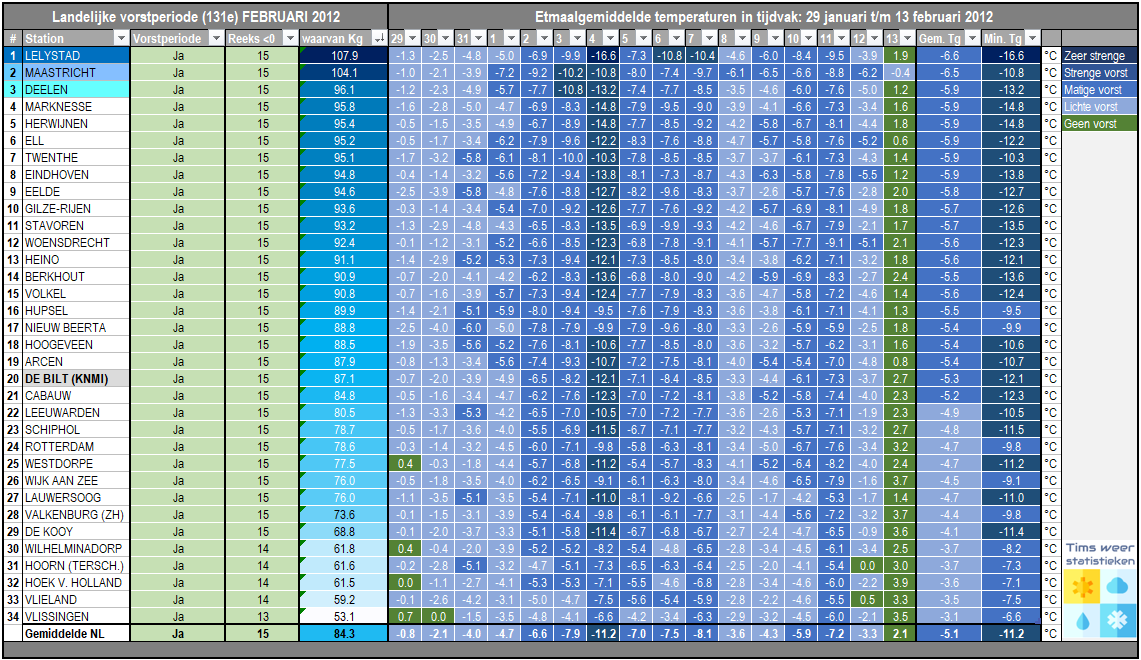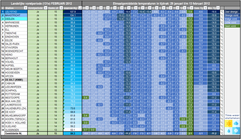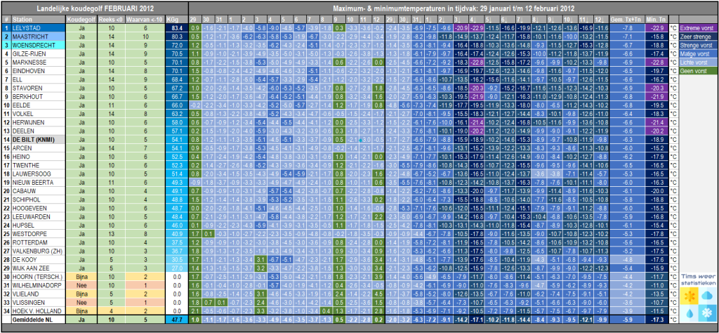 Met een landelijk gemiddelde temperatuur van -5,1°C en in De Bilt -5,3°C verliep de periode 29 januari t/m 13 februari 2012 zeer koud. Alleen in 1947 en 1917 was het gedurende deze periode kouder in De Bilt met respectievelijk -6,3°C en -5,4°C. In 1956 lag de temperatuur gedurende deze periode slechts een fractie hoger dan 2012 met -5,2°C in de Bilt, om aan te geven hoe bijzonder deze koudegolf was. De landelijke koudegolf van 2012 duurde 10 dagen, van 30 januari t/m 8 februari. In De Bilt kwam het op 5 dagen tot strenge vorst. In Maastricht duurde de koudegolf 14 dagen en kwam het maar liefst 10 keer tot strenge vorst. Hieronder volgt een weerdagboek en de winterstatistieken van deze bijzondere periode.