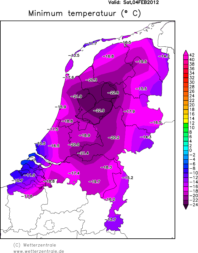 Gisterenavond trok de bewolking van de sneeuwstoring naar Belgie weg, werd het helder en met weinig wind ging de temperatuur boven de verse sneeuwlagen als een speer omlaag, zo vroor het om zeven uur in Lelystad al 14,9 graden. Nabij het IJssel-/Markermeer kwam het op verschillende plaatsen tot extreme vorst (< -20°C). De bevroren en besneeuwde meren diende in het laaggelegen gebied als zogenaamde koudepoel en met nauwelijks wind was er sprake van maximale uitstraling. Uiteindelijk tekenen we recordwaarden in Flevoland aan; in Lelystad -22,9°C en in Marknesse Noordoostpolder -22,8°C. De laatste keer met temperaturen van deze ordegrootte was 8 januari 1985. Maar ook in Berkhout, Noord-Holland meer dan 20 graden vorst, -21,9°C. Herwijnen -21,4°C en Cabauw -20,0°C. Verder ontstond er plaatselijk dichte tot soms zeer dichte mist boven de verse sneeuw in vooral het midden, westen en zuiden.