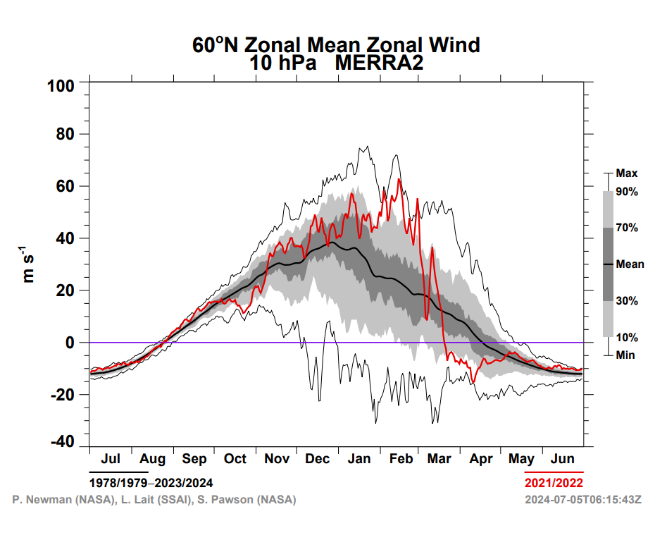 Je ziet dat nog weleens bij een sterk ontwikkelde stratosferische poolwervel in de winter, dat het vroeg, in maart al, tot een final warming komt. Ik moet daarbij denken aan 2022, drie jaar terug. Normaal vindt de final warming pas in april plaats. Vorig jaar na een dubbele SSW zelfs pas in mei.