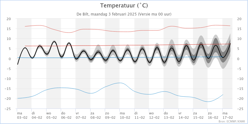 Alleen de periode 7 tot 13 februari is een fractie te koud. Er moet nog flink aan gesleuteld worden. Wellicht zorgt de retrograadse beweging van het hoog richting Groenland nog voor serieuzere kou later deze maand.