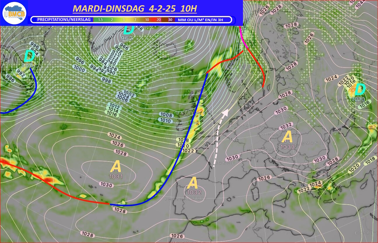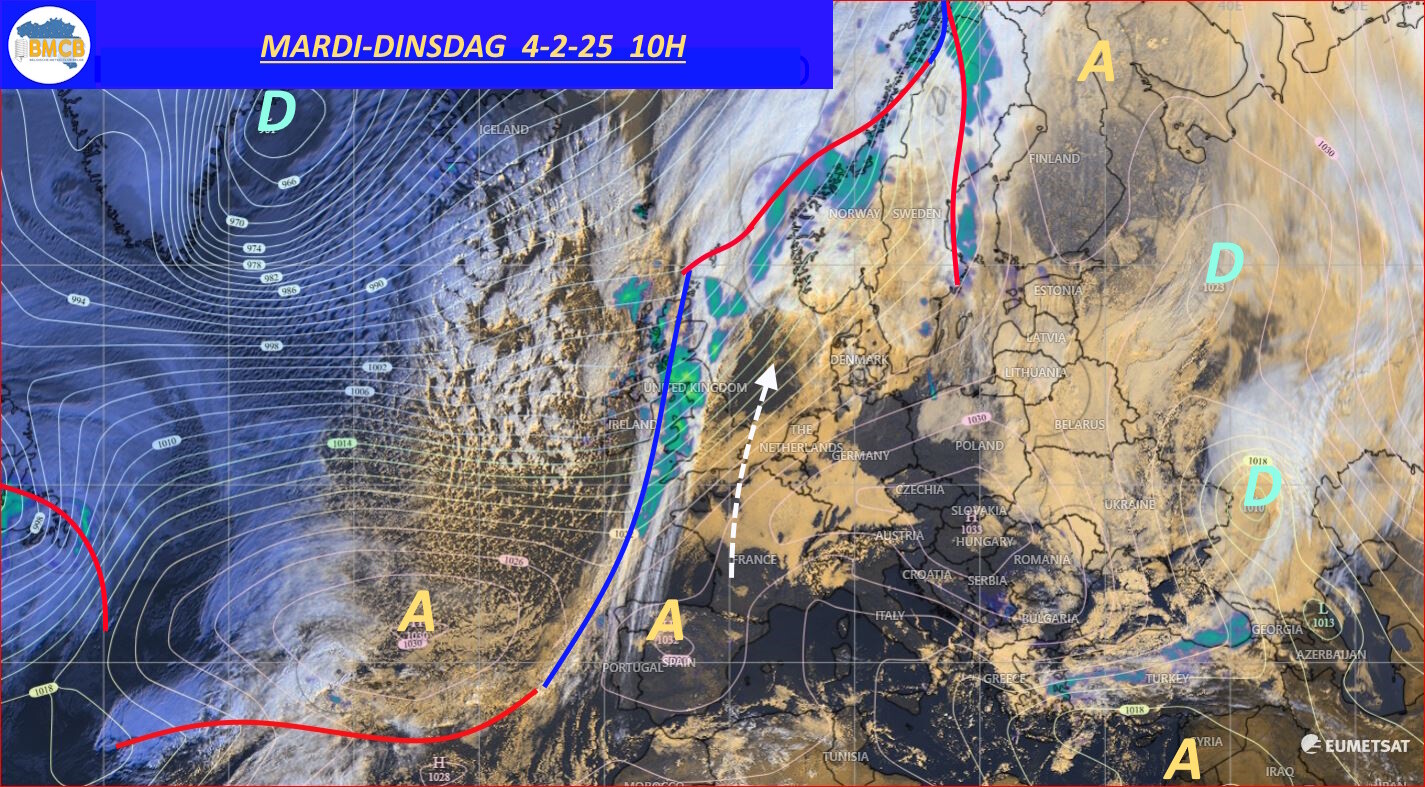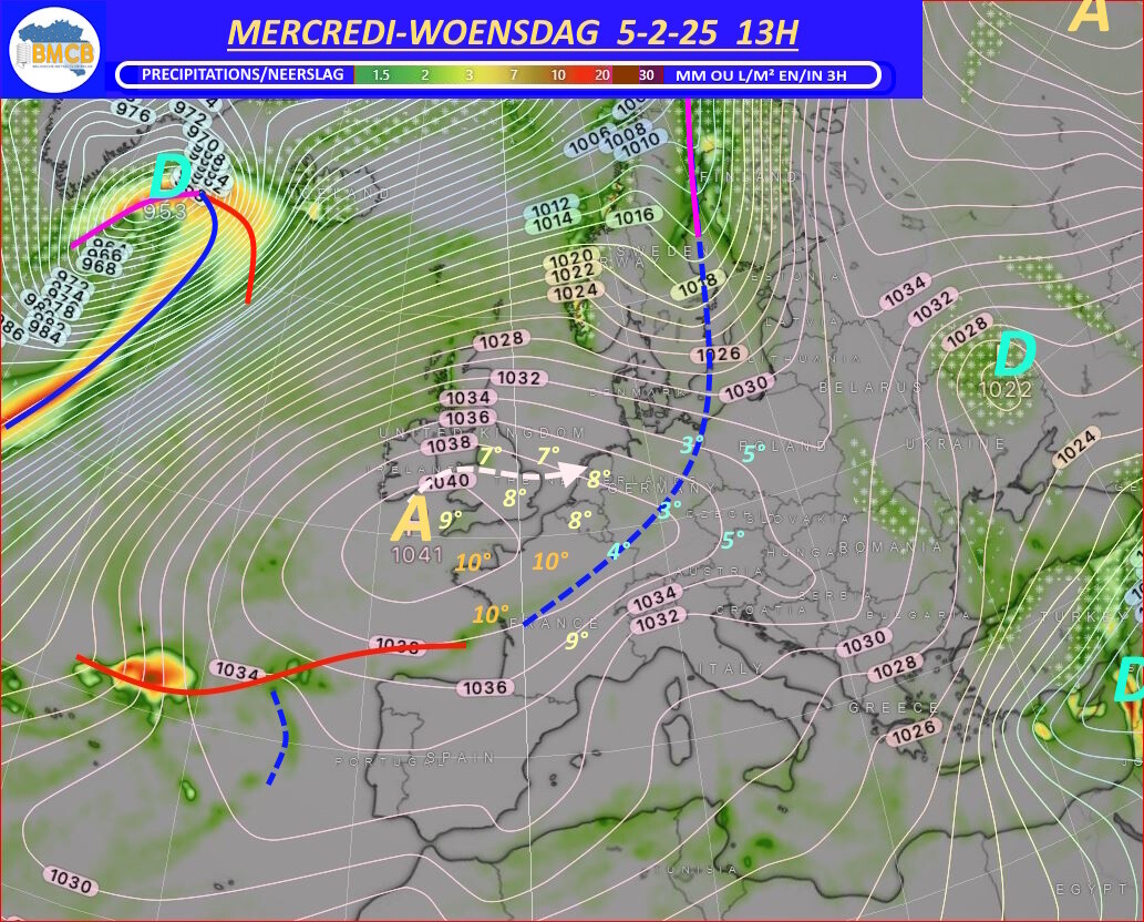 Een zwakke storing zal vannacht oostwaarts over de Benelux trekken en wordt op woensdag gevolgd door een hogedrukgebied (1041 hPa) boven het zuidwesten van de Britse Eilanden.