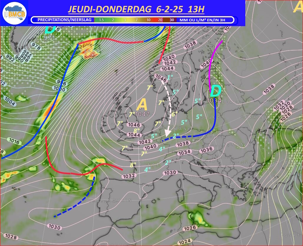 Tijdens het weekend en begin volgende week zal het belangrijkste centrum van het hogedrukgebied (1052-1046 hPa) zich vestigen boven Scandinavië. Aan de zuidelijke flank zal een continentale oost- tot noordoostelijke stroming ontstaan, die aanvankelijk nog licht verstoord zal zijn, maar daarna zou moeten stabiliseren en uitdrogen.