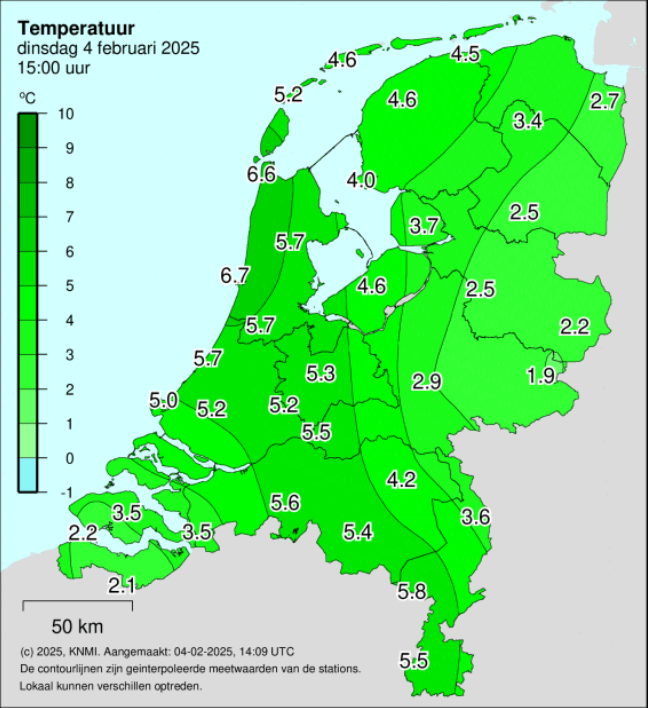 Hier al de hele dag rond 2-3°, koude Z-wind maakt het kouder voor het