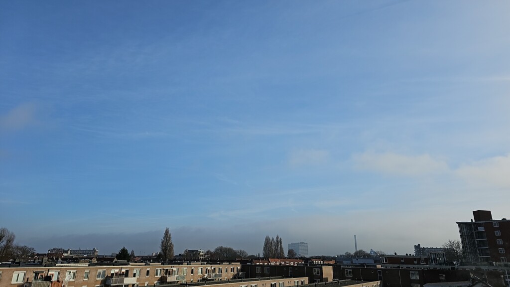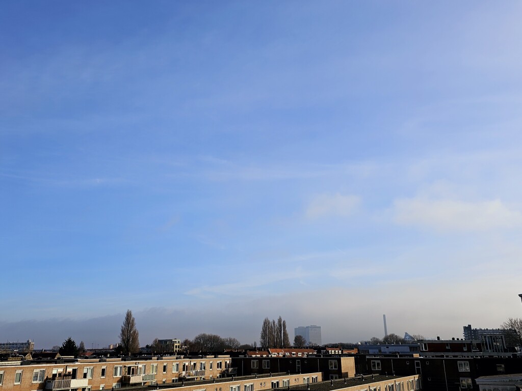 Hier zag ik vanuit een vrij zonnig Schiedam vandaag urenlang een mist/ stratusgrens richting Rotterdam en zuidwaarts