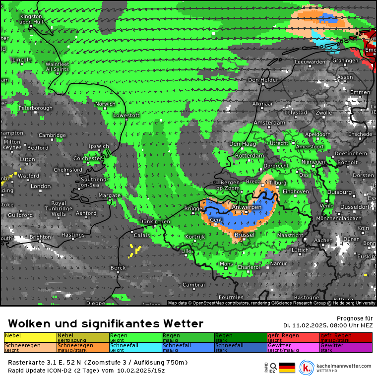 ICON-D2 komt nu met deze berekening voor morgenochtend: in het noorden van Vlaanderen en Zeeuws Vlaanderen enige tijd sneeuwval. Maar alle runs zijn weer anders, en de modellen verschillen in detail nogal van elkaar.