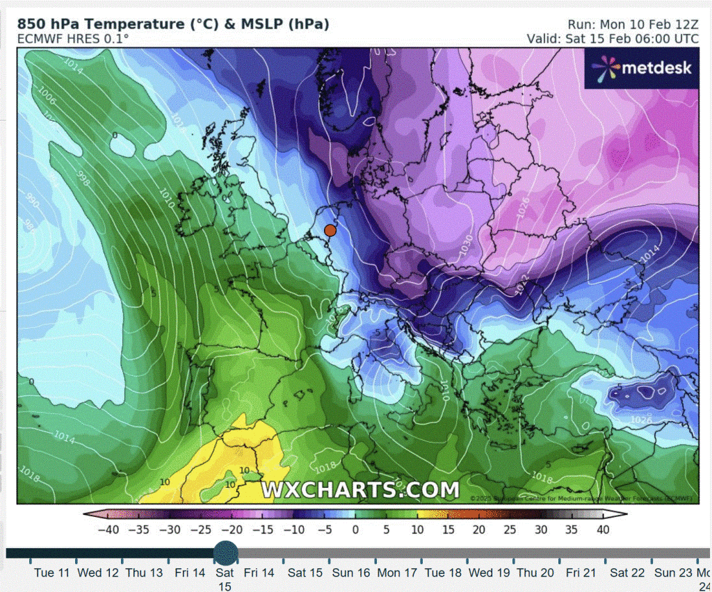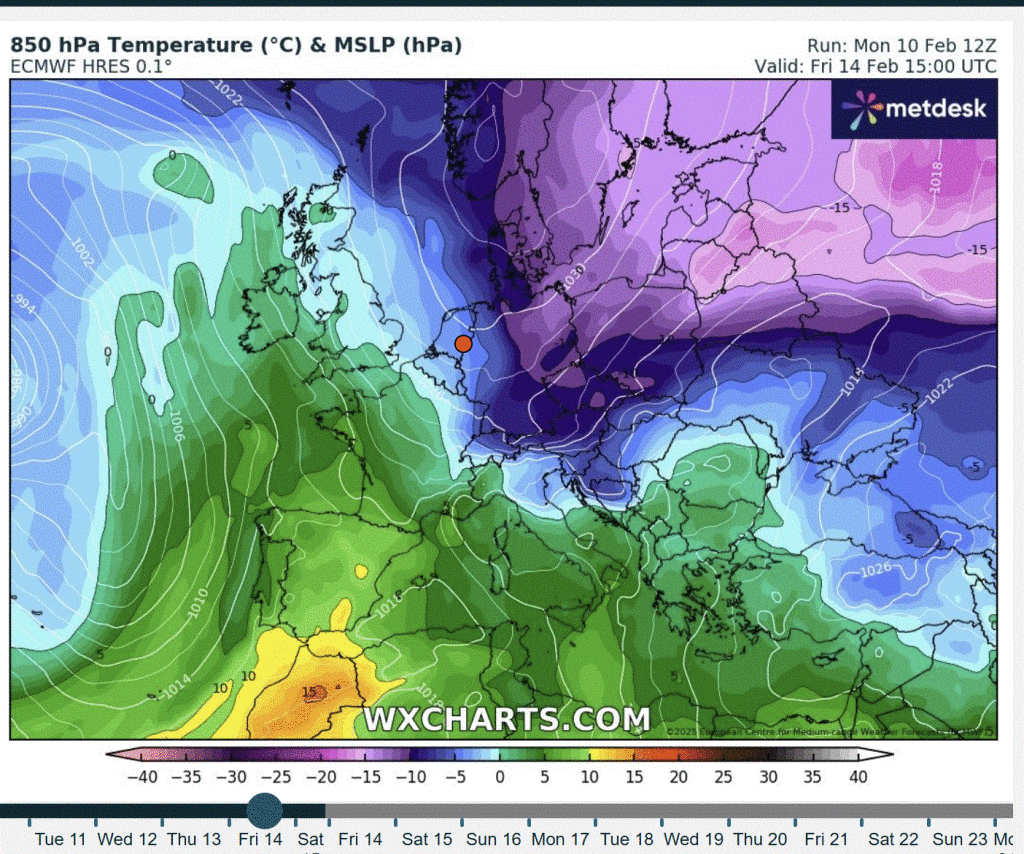 -10c op 850 hPa goed op weg naar de Lage Landen. Toch? De natuur beslist anders, zie de kaart op 15 februari.