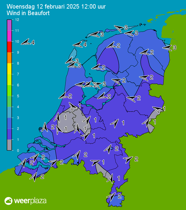 Er is een duidelijke lijn over Nederland te ontdekken met ten zuiden daarvan zuidenwind met oplopende temperaturen en ten noorden ervan (noord)oosten wind met dalende temperaturen. Thuis in Haarlem een dalende lijn, op mijn werk in Amstelveen een aardig oplopende temperatuur inmiddels.