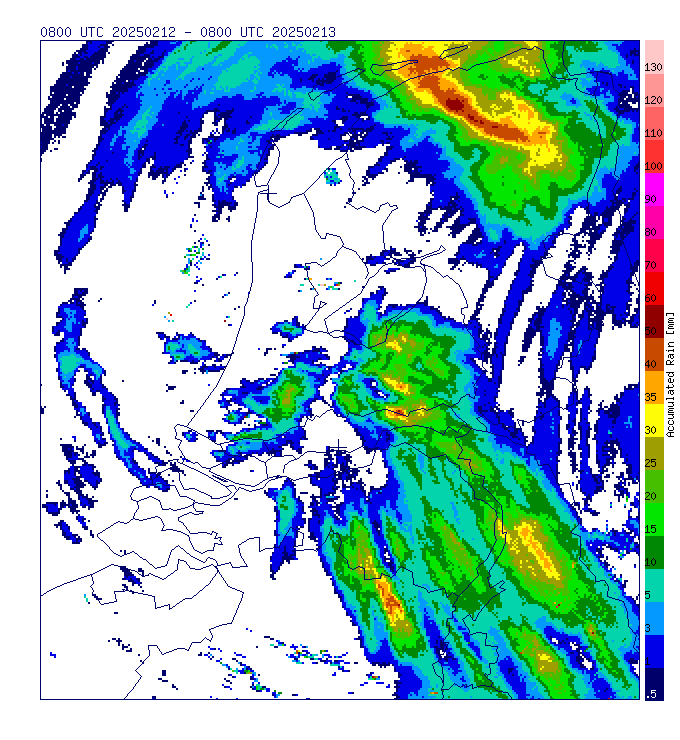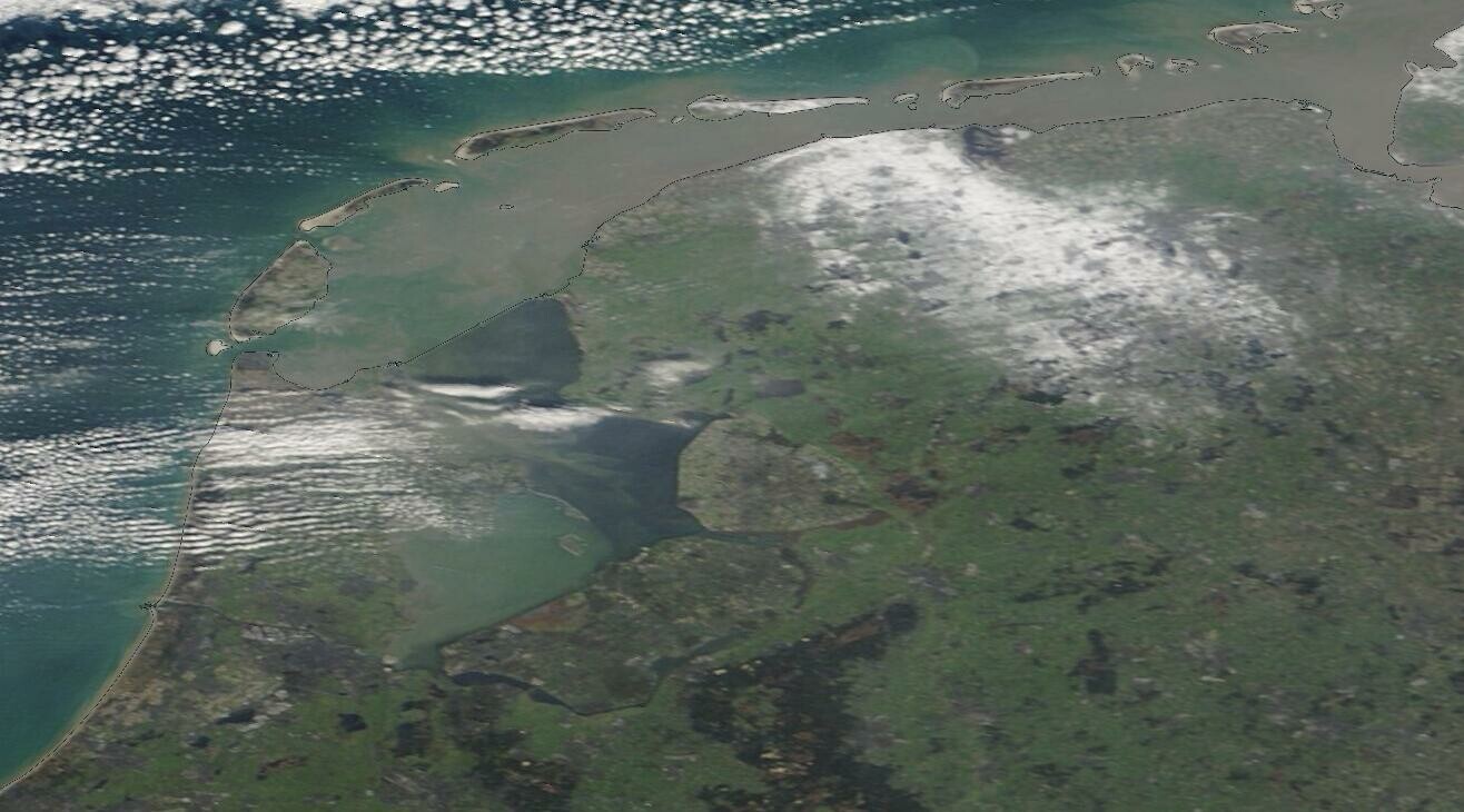 Opname van NASA Worldview vandaag. Komt goed overeen met de cumulatieve radar van die dag (van 't KNMI) met het strookje in beeld, hoewel de radarhoeveelheid iets overtrokken lijkt.
