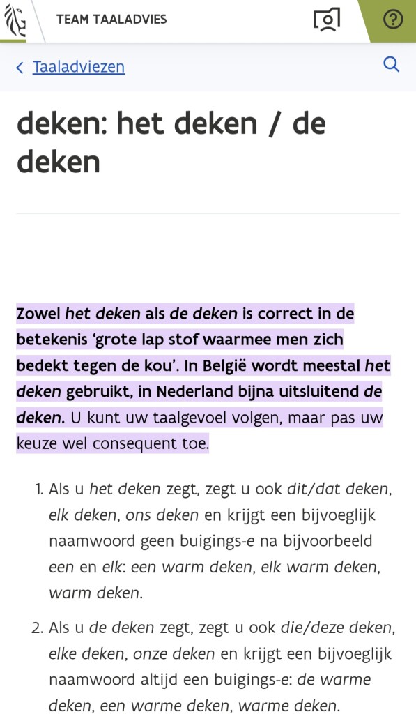 Qua taalgevoel wringt bij mij 'de deken' tegen. Vlug even opgezocht, en blijkt dat het in Nederland courant gebruikt wordt zo.