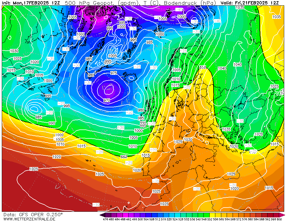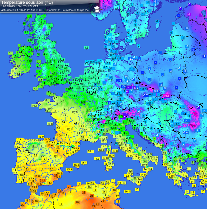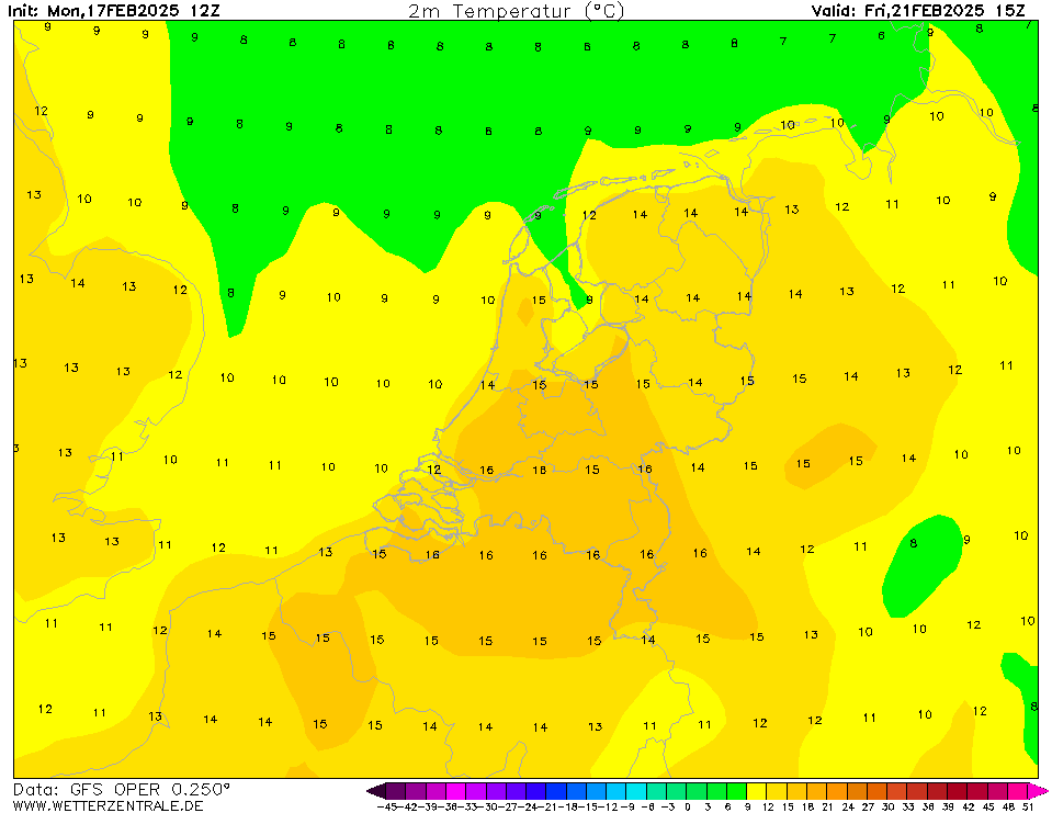 15 - 17 graden. Misschien wel hoger in Vlaanderen en zuiden Noord Brabant. Maar waar zit die warmte dan? Dat moet dan toch die bel zachte lucht boven zuidwest Frankrijk en noorden van Spanje zijn die op transport gaat? Het binnenland van Spanje is verder niet opvallend warm. Aangenaam maar meer ook niet.