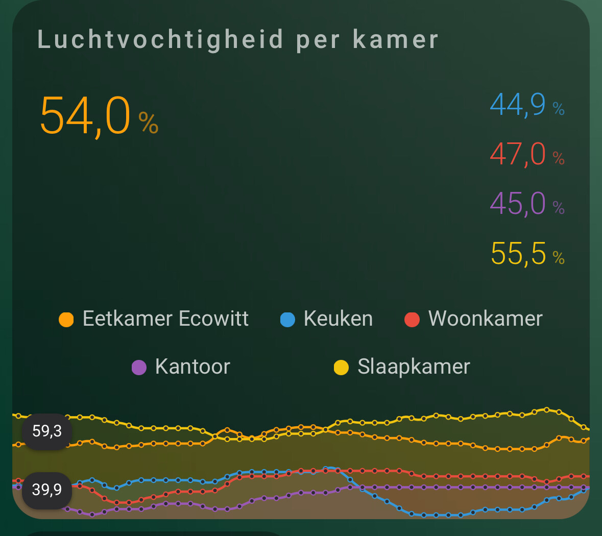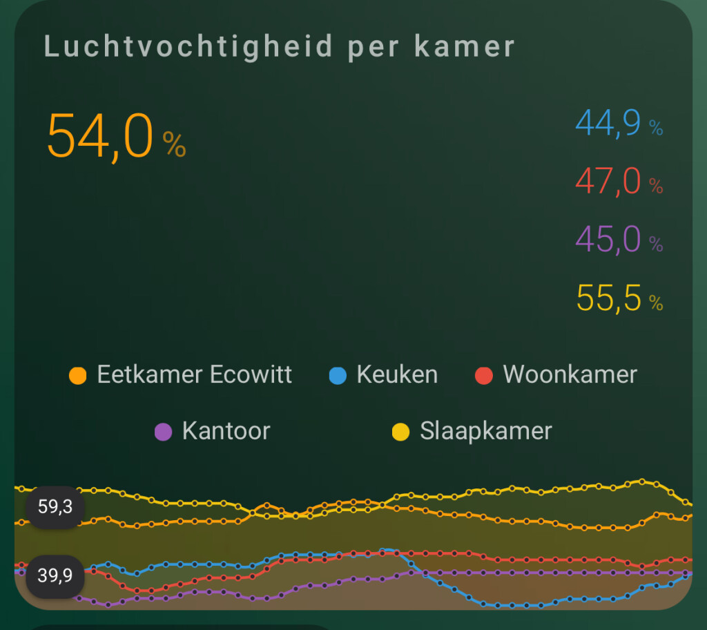 In de woonkamer met leemstuc (dat werkt als buffer) is het warmst en droogst. Gisteren na ventilatie zat die op 39%, maar je ziet dat de leemstuc snel terugbuffert.