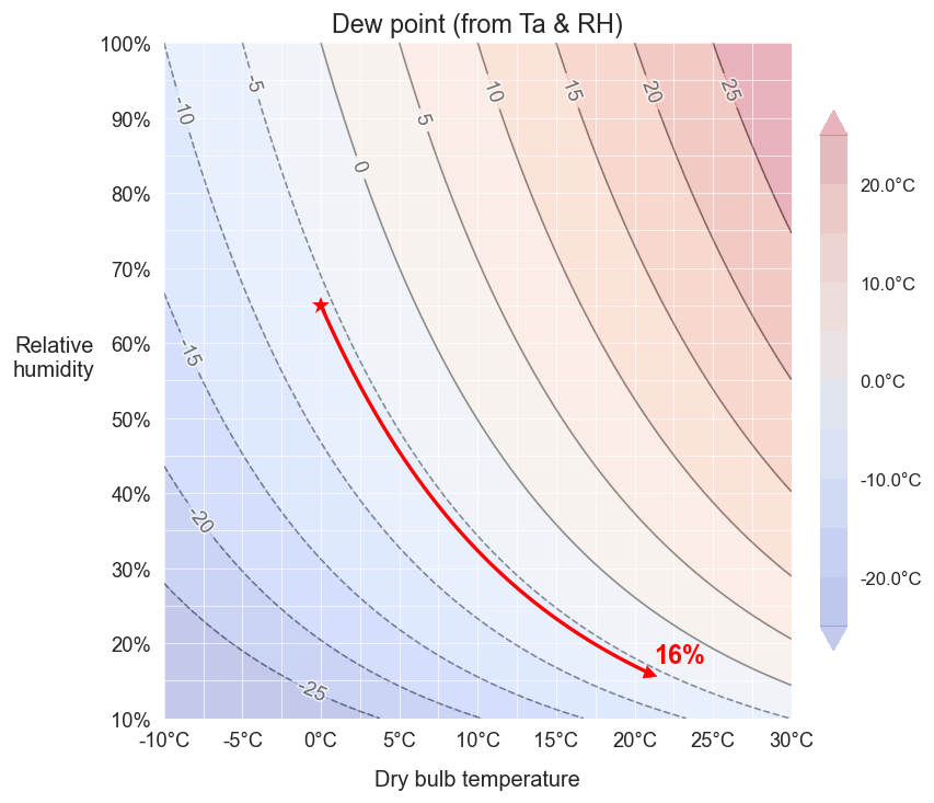 Als je die lucht opwarmt zonder vocht toe te voegen, dus bijvoorbeeld de kachel aan te zetten, dan zal die lucht opwarmen maar het dauwpunt zal constant blijven. Warm je de kucht bijvoorbeeld op tot 21°C dan eindig je rond een RH van 16%. De onderstaande afbeelding laat het traject van de RH zien naarmate de lucht opwarmt.