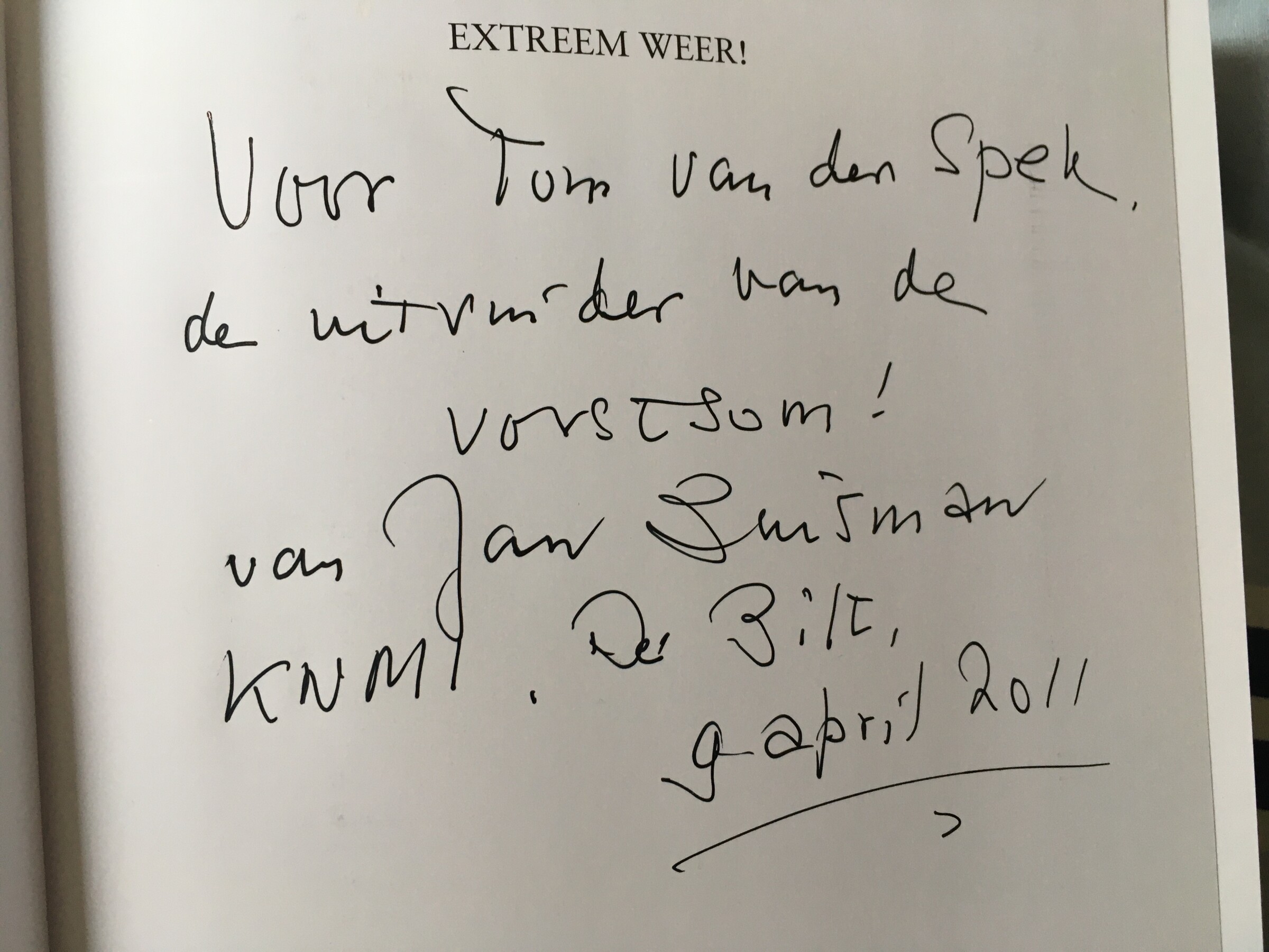 Ik heb hem meermaals gesproken en lezingen van hem bijgewoond. Ik ben er ook trots op dat hij mij heeft erkend als de uitvinder van de vorstsom, getuige de wijze hoe hij zijn boek Extreem weer voor mij heeft gesigneerd (zie foto).