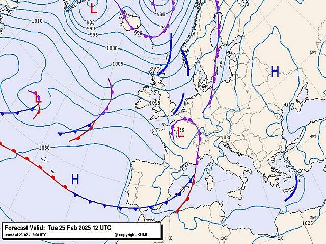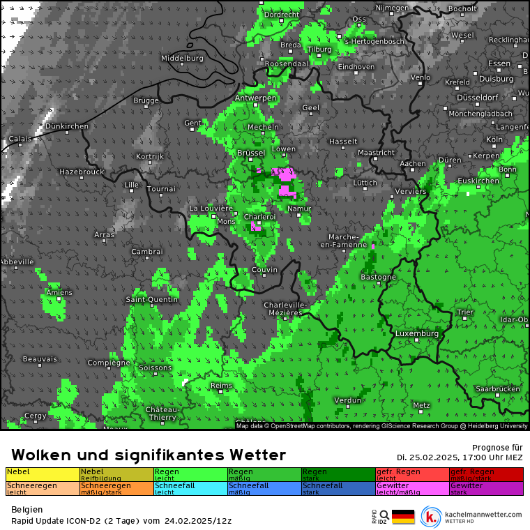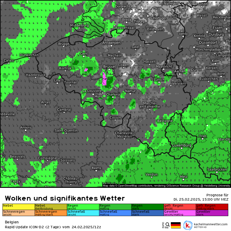 Meerdere modellen komen voor morgen in de namiddag en het begin van de avond al een paar runs met plaatselijke flinke buien over Belgie, mogelijk zelfs met onweer. De synoptische situatie is in detail niet eenvoudig: een gekruld occlusiefront bij een laagje over noord Frankrijk zorgt volgens sommige berekeningen voor een soort frontogenese aan de noordwestkant ervan, doordat een troglijn over Nederland zich aan het occlusiefront voegt. Dat is tenminste wat ik ervan maak, naar aanleiding van de KNMI-weerkaart. Het is me niet duidelijk hoe dit dynamisch precies in elkaar zit.
