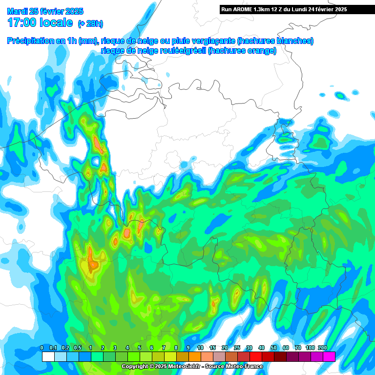 Arome 12Z geeft de buien in het westen, terwijl ICON-D2 12 Z het op een meer oostelijke ontwikkeling houdt. De 15Z-run geeft een wat minder uitgesprpoken ontwikkeling. Ook verschillen de runs nogal in de noordelijke uitbreiding ervan. Swiss-HD heeft ook wel wat van deze ontwikkeling, maar zonder zware buien. Bij het geheel moet dus nog een vraagteken geplaatst worden.