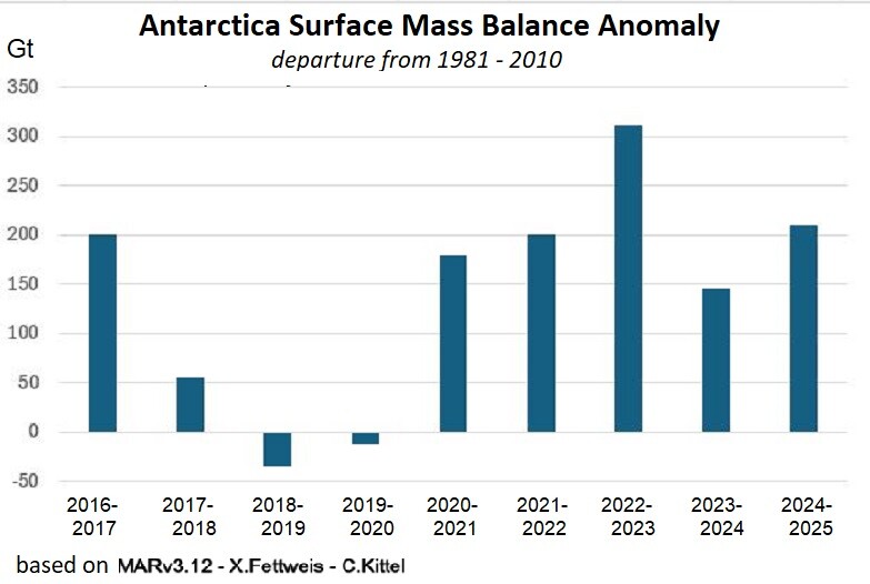 De SMB wordt berekend door X. Fettweis van de Universiteit van Luik, op basis van weermodellen, (inclusief voorspelling, daardoor is er al een eindcijfer) . Anders dan op Groenland zijn er nauwelijks metingen aan de grond, er kan dus ook een forse foutmarge in zitten. In de SMB zijn sneeuwval, regenval, smelt, verdamping, herbevriezing en afstroom al meegenomen. Door de opwarming nemen zowel de neerslag als de smelt toe. Voor de SMB pakt dat vooralsnog positief uit, de afgelopen jaren eindigde deze vaak ver boven het gemiddelde van 1981-2010.